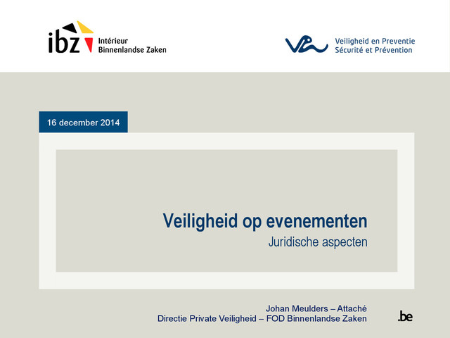 - Toegangscontrole, vrijhouden van doorgangen of nooduitgangen, backstage bewaking, kanalisatie en controle van het publiek, tussenkomen bij ruzies of wanordelijkheden, … • Goederenbewaking - Bewaking installaties, toezicht op parkings, … • Bodyguarding 16 december 2014