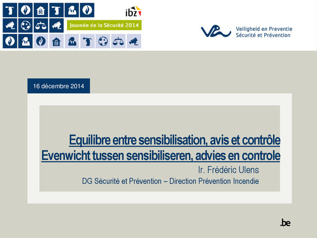 Campagne d’information • Incitation à l’autonomie • Délivrance d’avis Conscientisation du citoyen Bewust maken van de burger • "Police" de la prévention incendie • Délivrance de rapport pour les autorités Contrôle de la réglementation Controle van de regelgeving 16 décembre 2014 2