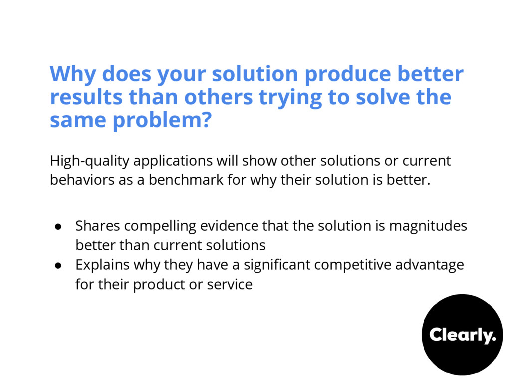 to solve the same problem? High-quality applications will show other solutions or current behaviors as a benchmark for why their solution is better. • Shares compelling evidence that the solution is magnitudes better than current solutions • Explains why they have a significant competitive advantage for their product or service