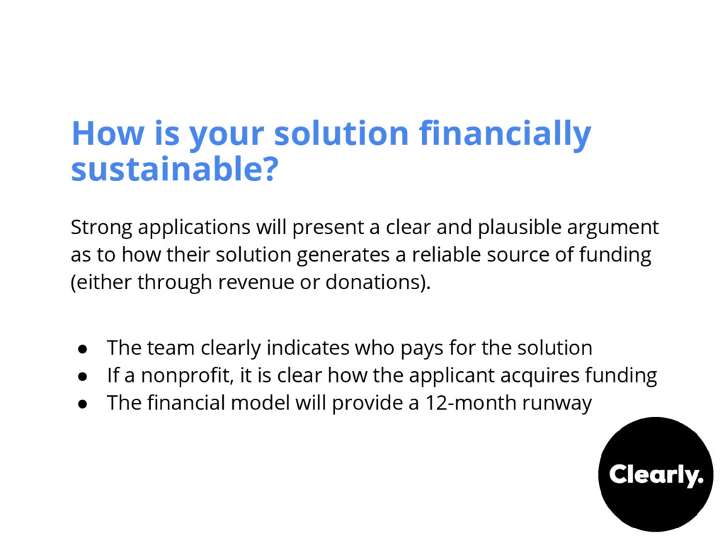 a clear and plausible argument as to how their solution generates a reliable source of funding (either through revenue or donations). • The team clearly indicates who pays for the solution • If a nonprofit, it is clear how the applicant acquires funding • The financial model will provide a 12-month runway