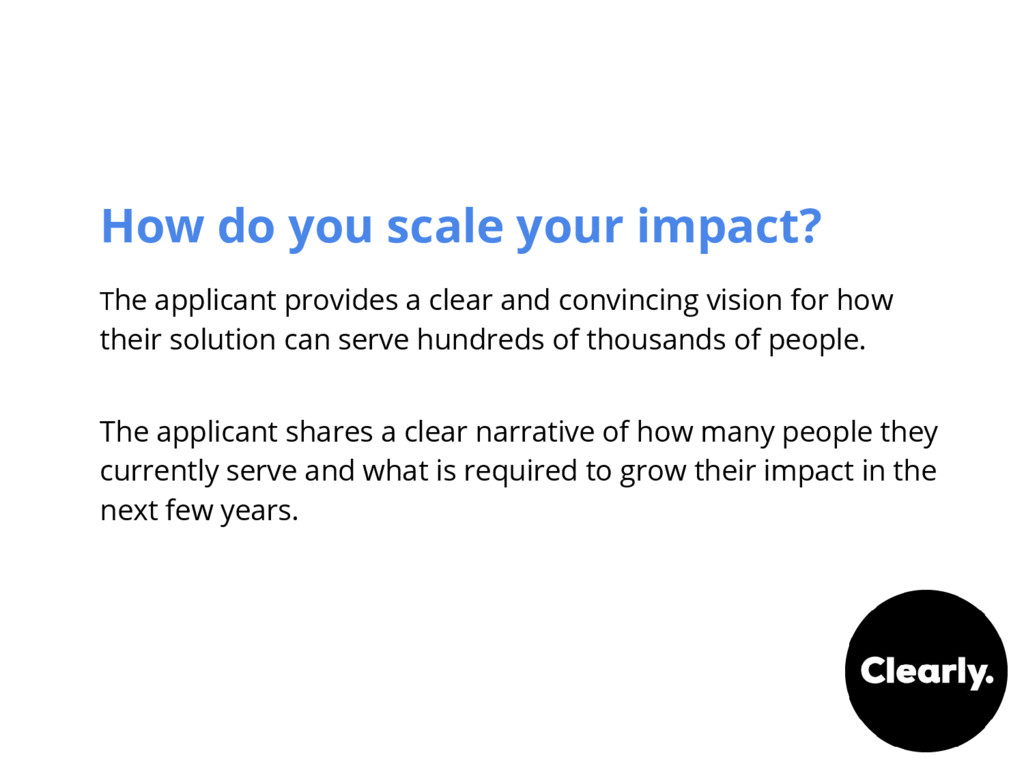 clear and convincing vision for how their solution can serve hundreds of thousands of people. The applicant shares a clear narrative of how many people they currently serve and what is required to grow their impact in the next few years.
