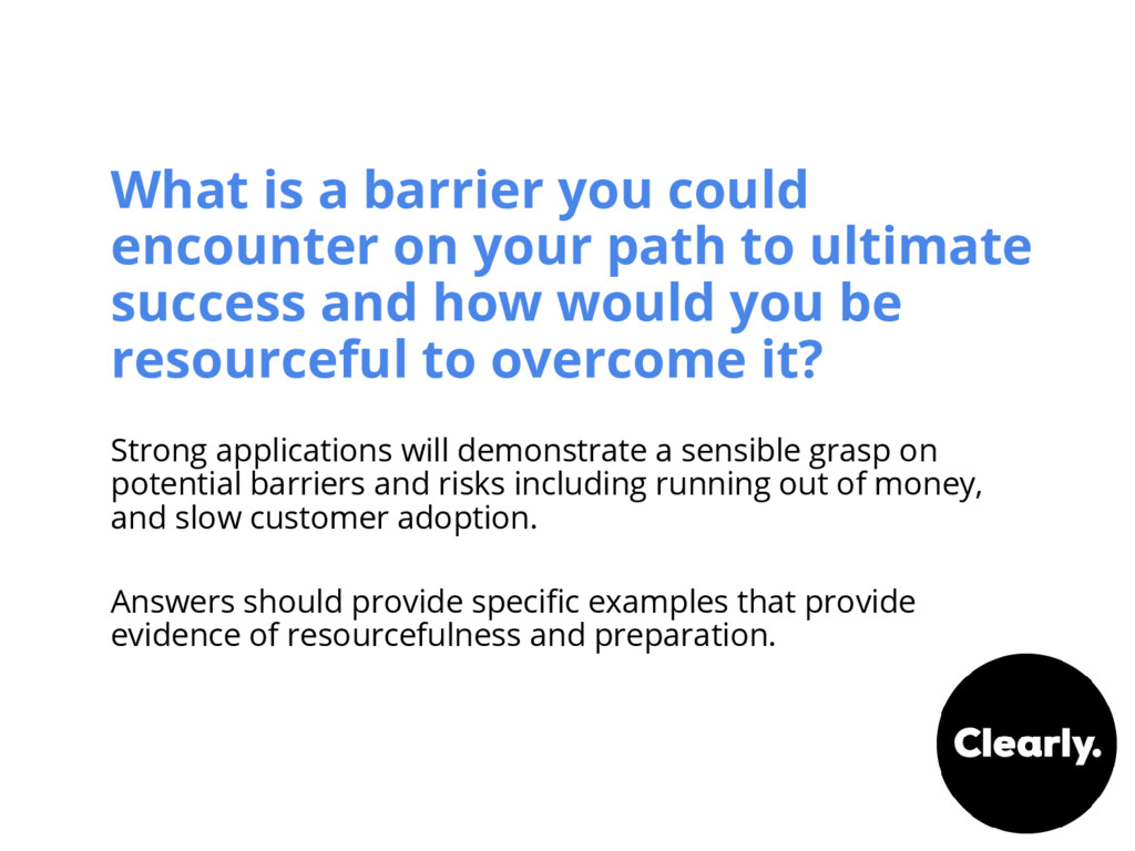 to ultimate success and how would you be resourceful to overcome it? Strong applications will demonstrate a sensible grasp on potential barriers and risks including running out of money, and slow customer adoption. Answers should provide specific examples that provide evidence of resourcefulness and preparation.