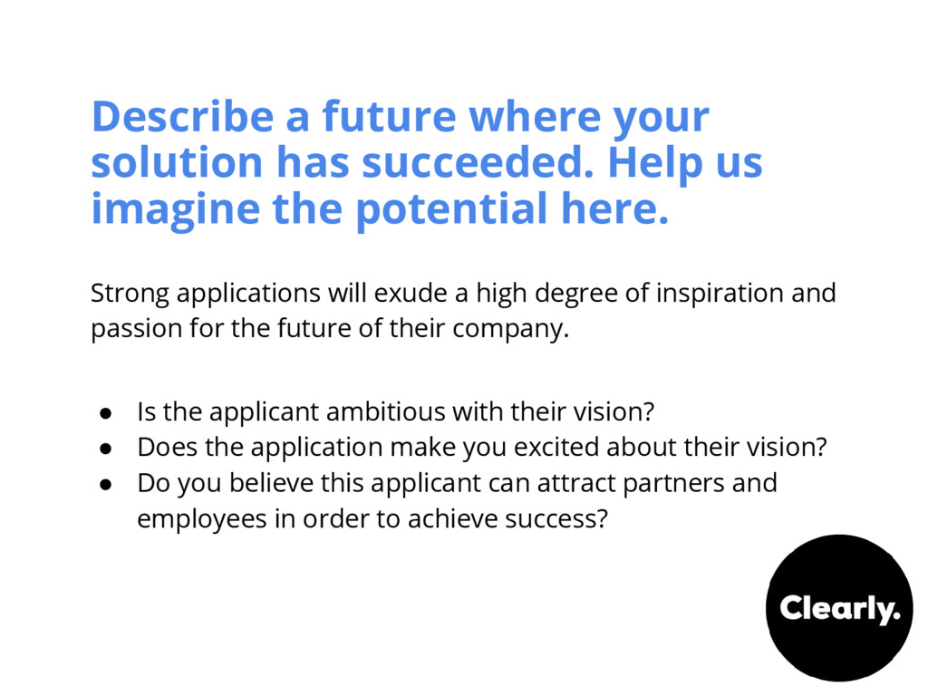 imagine the potential here. Strong applications will exude a high degree of inspiration and passion for the future of their company. • Is the applicant ambitious with their vision? • Does the application make you excited about their vision? • Do you believe this applicant can attract partners and employees in order to achieve success?