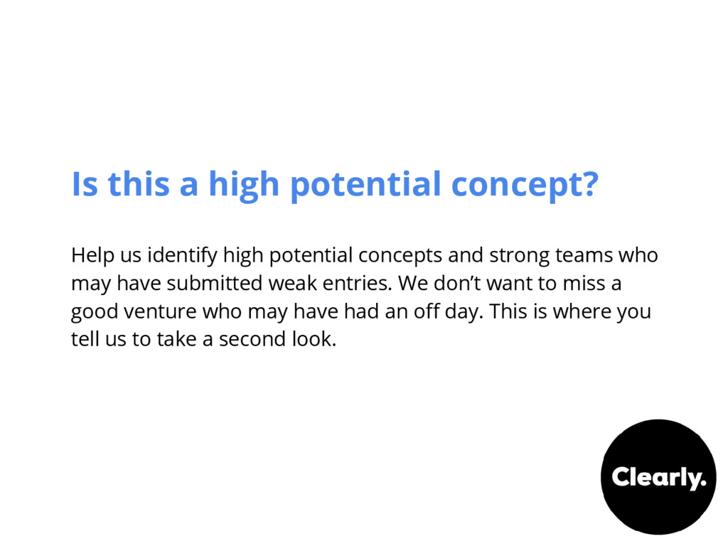 potential concepts and strong teams who may have submitted weak entries. We don’t want to miss a good venture who may have had an off day. This is where you tell us to take a second look.