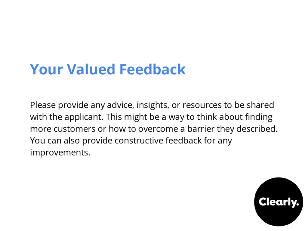 to be shared with the applicant. This might be a way to think about finding more customers or how to overcome a barrier they described. You can also provide constructive feedback for any improvements.