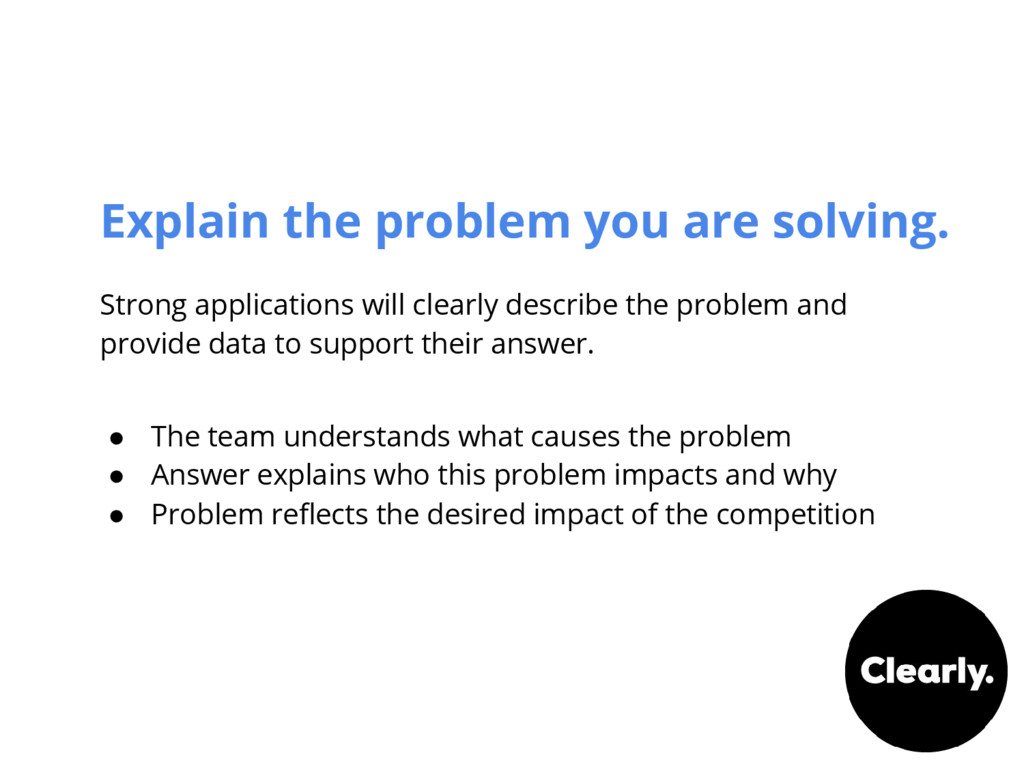 describe the problem and provide data to support their answer. • The team understands what causes the problem • Answer explains who this problem impacts and why • Problem reflects the desired impact of the competition