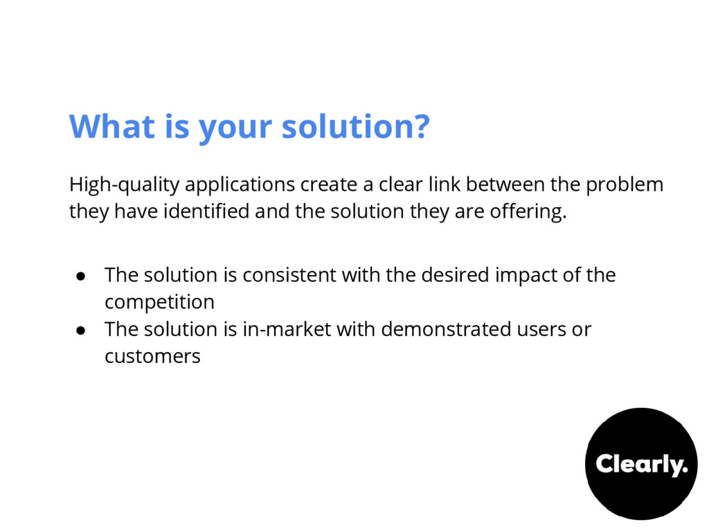 between the problem they have identified and the solution they are offering. • The solution is consistent with the desired impact of the competition • The solution is in-market with demonstrated users or customers