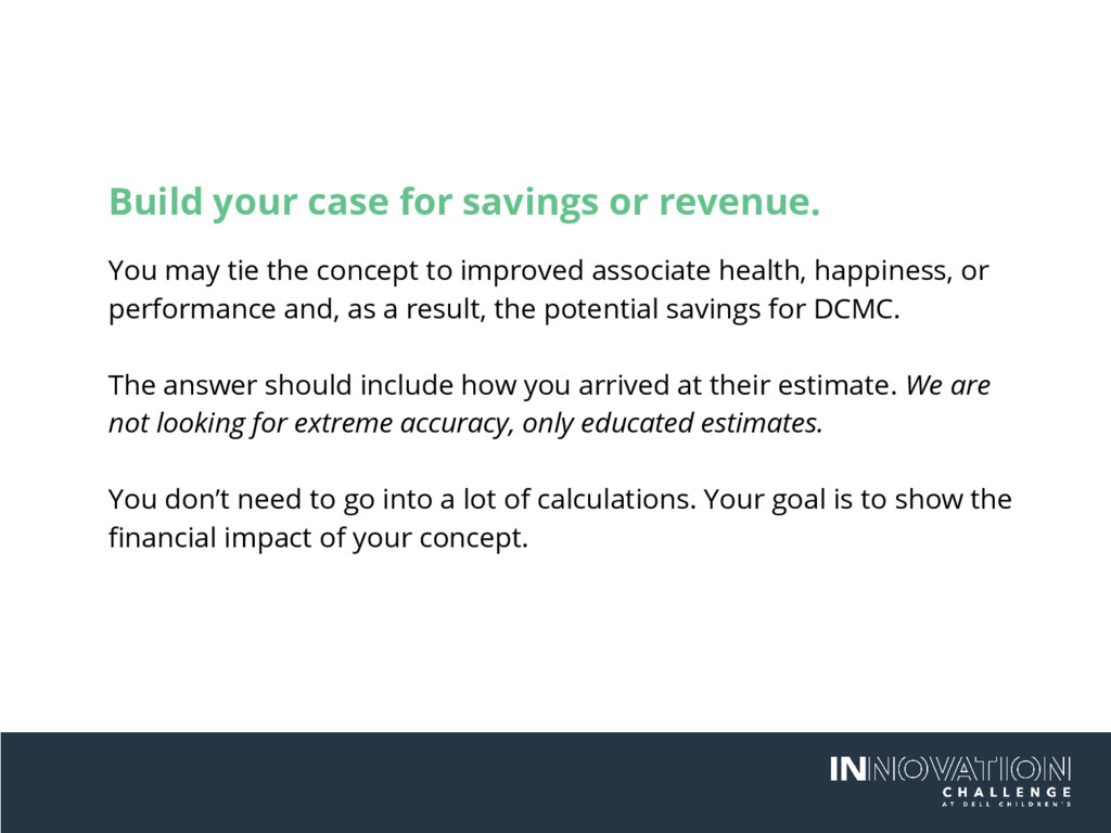 the concept to improved associate health, happiness, or performance and, as a result, the potential savings for DCMC. The answer should include how you arrived at their estimate. We are not looking for extreme accuracy, only educated estimates. You don’t need to go into a lot of calculations. Your goal is to show the financial impact of your concept.