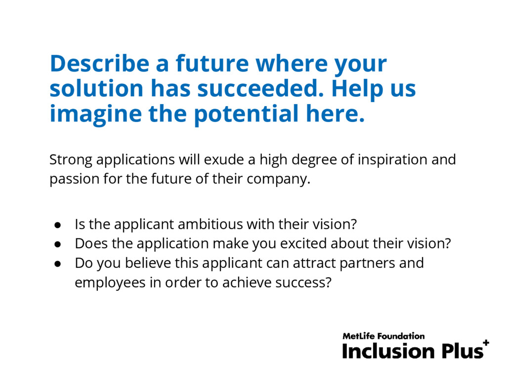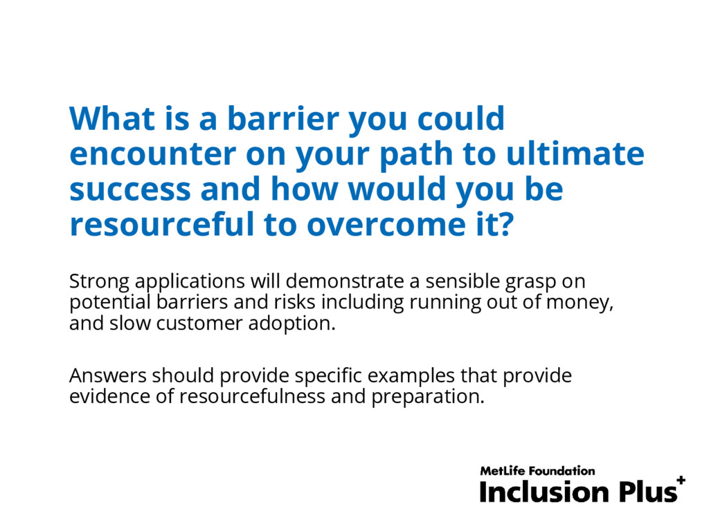 to ultimate success and how would you be resourceful to overcome it? Strong applications will demonstrate a sensible grasp on potential barriers and risks including running out of money, and slow customer adoption. Answers should provide specific examples that provide evidence of resourcefulness and preparation.