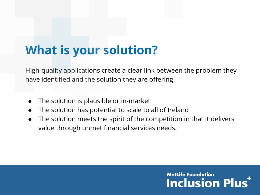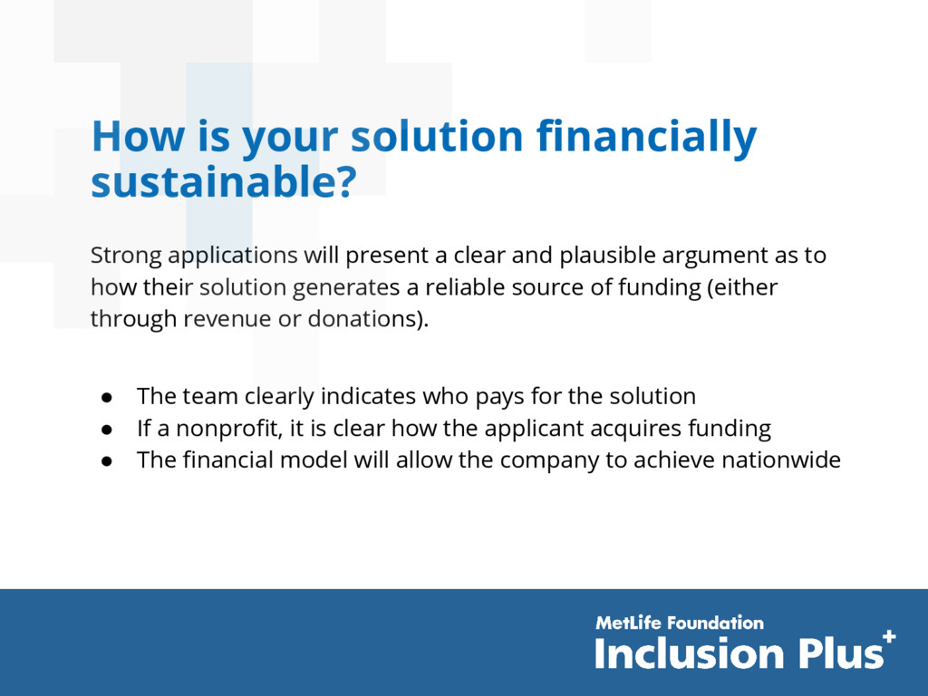 a clear and plausible argument as to how their solution generates a reliable source of funding (either through revenue or donations). • The team clearly indicates who pays for the solution • If a nonprofit, it is clear how the applicant acquires funding • The financial model will allow the company to achieve nationwide