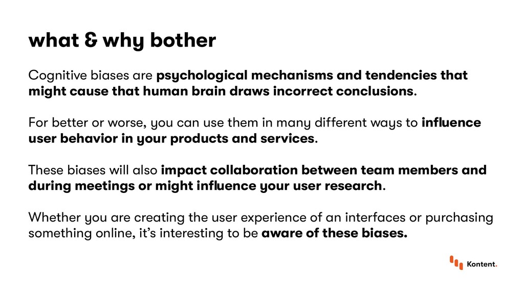 that human brain draws incorrect conclusions. For better or worse, you can use them in many different ways to influence user behavior in your products and services. These biases will also impact collaboration between team members and during meetings or might influence your user research. Whether you are creating the user experience of an interfaces or purchasing something online, it’s interesting to be aware of these biases. what & why bother