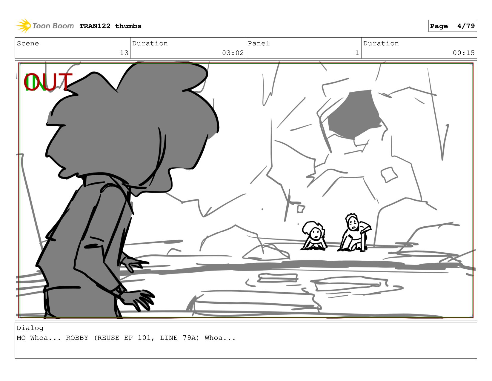 Scene 13 Duration 03:02 Panel 1 Duration 00:15 Dialog MO