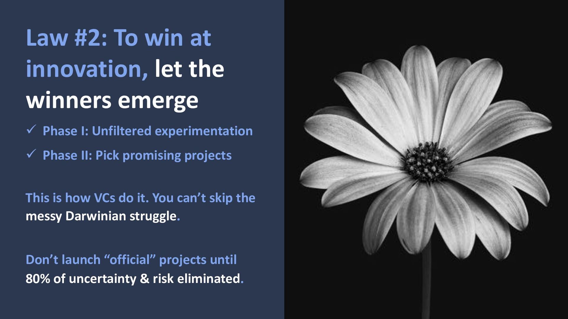 ü Phase I: Unfiltered experimentation ü Phase II: Pick promising projects This is how VCs do it. You can’t skip the messy Darwinian struggle. Don’t launch “official” projects until 80% of uncertainty & risk eliminated.