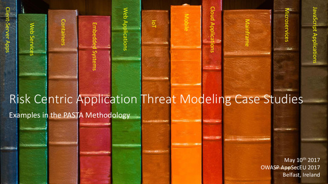PASTA Methodology May 10th 2017 OWASP AppSecEU 2017 Belfast, Ireland Web Services Client-Server Apps Containers Embedded Systems JavaScript Applications Microservices Mainframe Cloud Applications Mobile IoT Web Applications