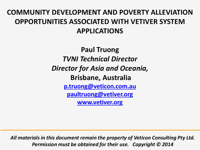 and Environmental Protection, application of the Vetiver System Technology also has a significant impact on the development and poverty alleviation of the local community, where it is carried out. The following case studies will demonstrate this enormous impact: 1. Poverty Alleviation , Children Education and Social Development in Bali, Indonesia 2. Poverty Alleviation and Rural Employment in Vietnam • The Ho Chi Minh Highway • Flood mitigation in the Mekong Delta 3. Poverty Alleviation and Resource Protection in China 4. Poverty Alleviation and Rural Employment in Madagascar. 5. Poverty Alleviation and Rural Employment in Venezuela INTRODUCTION