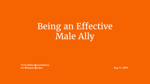 What does it mean to be an "ally"? Why do we need them? Join Etsy's Toria Gibbs and Ian Malpass to learn about being an effective male ally to women in tech. We'll provide an overview of the principles of feminism and offer practical steps that can be taken to curb unconscious bias and be effective allies to women in the workplace.