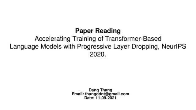 After that, there is a paper reading section about the paper: "Accelerating Training of Transformer Based Language Models with Progressive Layer Dropping" that was published at NeurIPS 2020.