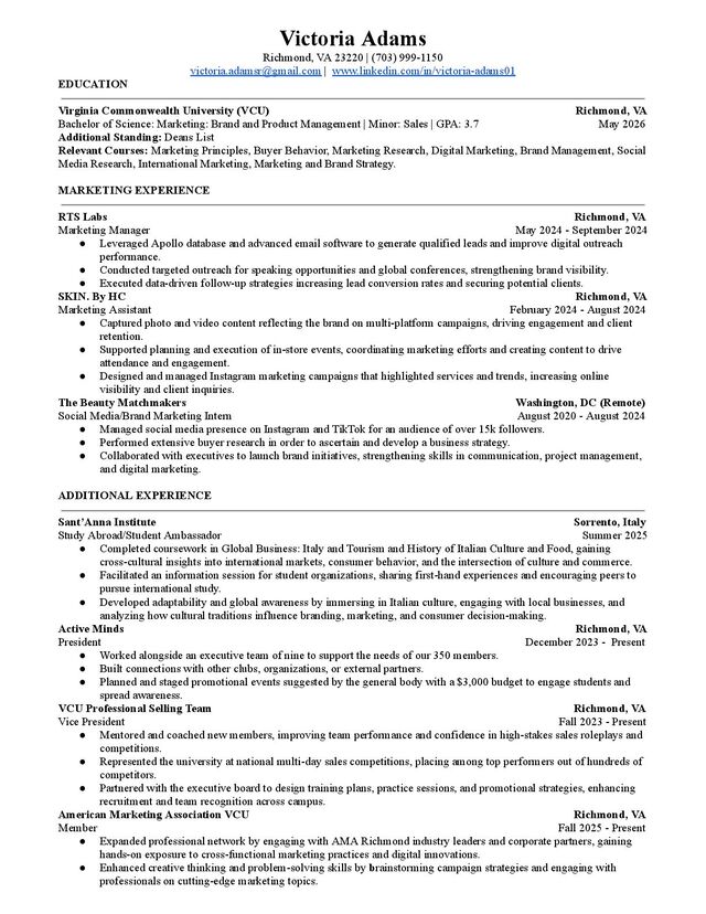 www.linkedin.com/in/victoria-adams01 EDUCATION Virginia Commonwealth University (VCU) Richmond, VA Bachelor of Science: Marketing: Brand and Product Management | Minor: Sales | GPA: 3.7 May 2026 Additional Standing: Deans List Relevant Courses: Marketing Principles, Buyer Behavior, Marketing Research, Digital Marketing, Brand Management, Social Media Research, International Marketing, Marketing and Brand Strategy. MARKETING EXPERIENCE RTS Labs Richmond, VA Marketing Manager May 2024 - September 2024 • Leveraged Apollo database and advanced email software to generate qualified leads and improve digital outreach performance. • Conducted targeted outreach for speaking opportunities and global conferences, strengthening brand visibility. • Executed data-driven follow-up strategies increasing lead conversion rates and securing potential clients. SKIN. By HC Richmond, VA Marketing Assistant February 2024 - August 2024 • Captured photo and video content reflecting the brand on multi-platform campaigns, driving engagement and client retention. • Supported planning and execution of in-store events, coordinating marketing efforts and creating content to drive attendance and engagement. • Designed and managed Instagram marketing campaigns that highlighted services and trends, increasing online visibility and client inquiries. The Beauty Matchmakers Washington, DC (Remote) Social Media/Brand Marketing Intern August 2020 - August 2024 • Managed social media presence on Instagram and TikTok for an audience of over 15k followers. • Performed extensive buyer research in order to ascertain and develop a business strategy. • Collaborated with executives to launch brand initiatives, strengthening skills in communication, project management, and digital marketing. ADDITIONAL EXPERIENCE Sant’Anna Institute Sorrento, Italy Study Abroad/Student Ambassador Summer 2025 • Completed coursework in Global Business: Italy and Tourism and History of Italian Culture and Food, gaining cross-cultural insights into international markets, consumer behavior, and the intersection of culture and commerce. • Facilitated an information session for student organizations, sharing first-hand experiences and encouraging peers to pursue international study. • Developed adaptability and global awareness by immersing in Italian culture, engaging with local businesses, and analyzing how cultural traditions influence branding, marketing, and consumer decision-making. Active Minds Richmond, VA President December 2023 - Present • Worked alongside an executive team of nine to support the needs of our 350 members. • Built connections with other clubs, organizations, or external partners. • Planned and staged promotional events suggested by the general body with a $3,000 budget to engage students and spread awareness. VCU Professional Selling Team Richmond, VA Vice President Fall 2023 - Present • Mentored and coached new members, improving team performance and confidence in high-stakes sales roleplays and competitions. • Represented the university at national multi-day sales competitions, placing among top performers out of hundreds of competitors. • Partnered with the executive board to design training plans, practice sessions, and promotional strategies, enhancing recruitment and team recognition across campus. American Marketing Association VCU Richmond, VA Member Fall 2025 - Present • Expanded professional network by engaging with AMA Richmond industry leaders and corporate partners, gaining hands-on exposure to cross-functional marketing practices and digital innovations. • Enhanced creative thinking and problem-solving skills by brainstorming campaign strategies and engaging with professionals on cutting-edge marketing topics.