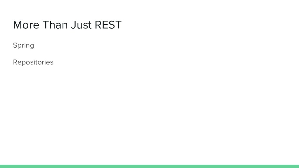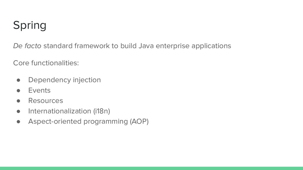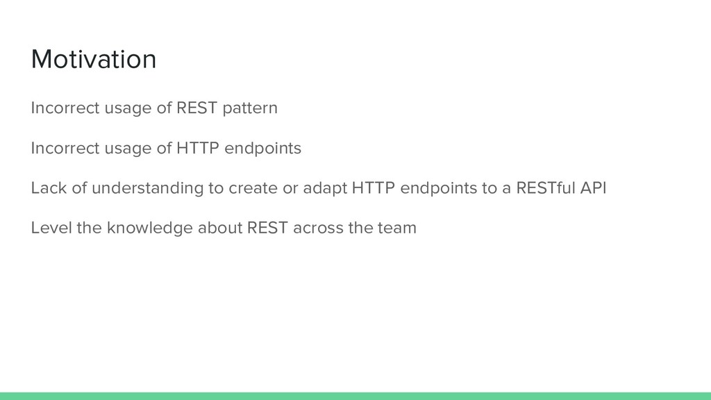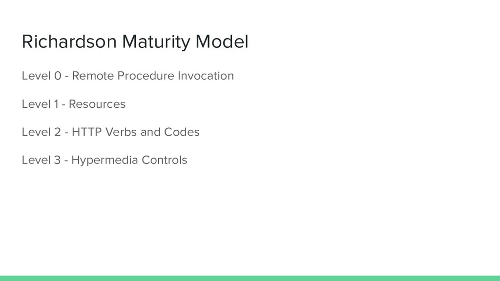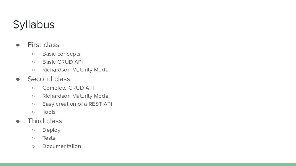 API ◦ Richardson Maturity Model • Second class ◦ Complete CRUD API ◦ Richardson Maturity Model ◦ Easy creation of a REST API ◦ Tools • Third class ◦ Deploy ◦ Tests ◦ Documentation