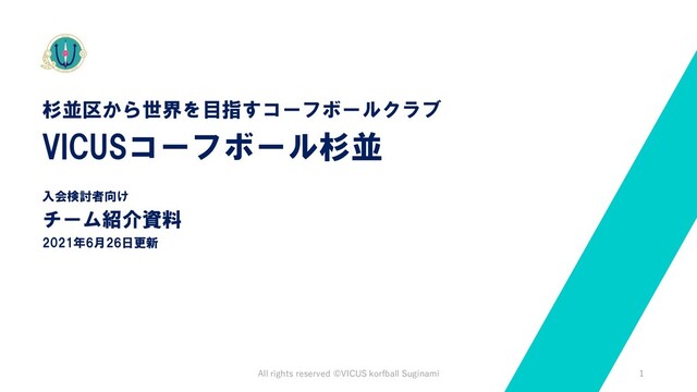 杉並区の西荻窪を拠点に活動しているコーフボールチーム「VICUSコーフボール杉並」のチーム紹介資料です! ●HP https://www.my-spw.com/ ●twitter https://twitter.com/vicus_korfball ●Instagram https://www.instagram.com/vicus_korfball/?hl=ja ●note https://note.com/vicus_korfaball/m/md7c677b94a1b