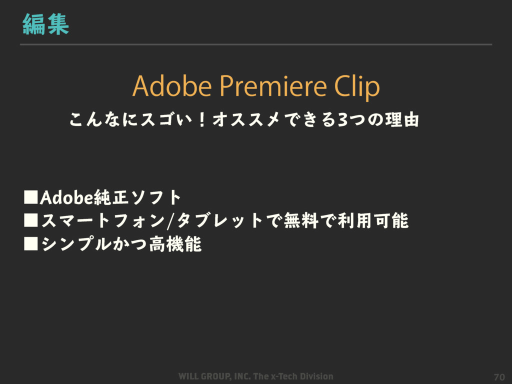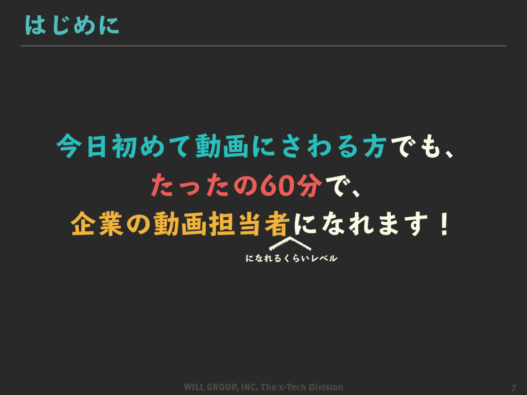 株式会社ウィルグループ クロステクノロジー部が開催した企業の社内動画制作セミナー『たった60分で、知識ゼロから企業の動画担当者になれちゃうセミナー』の資料となります。 http://www.video-space.com/