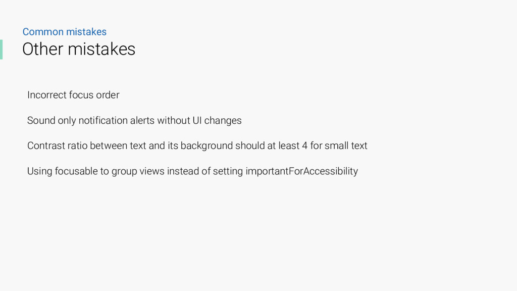 UI changes Contrast ratio between text and its background should at least 4 for small text Using focusable to group views instead of setting importantForAccessibility Common mistakes