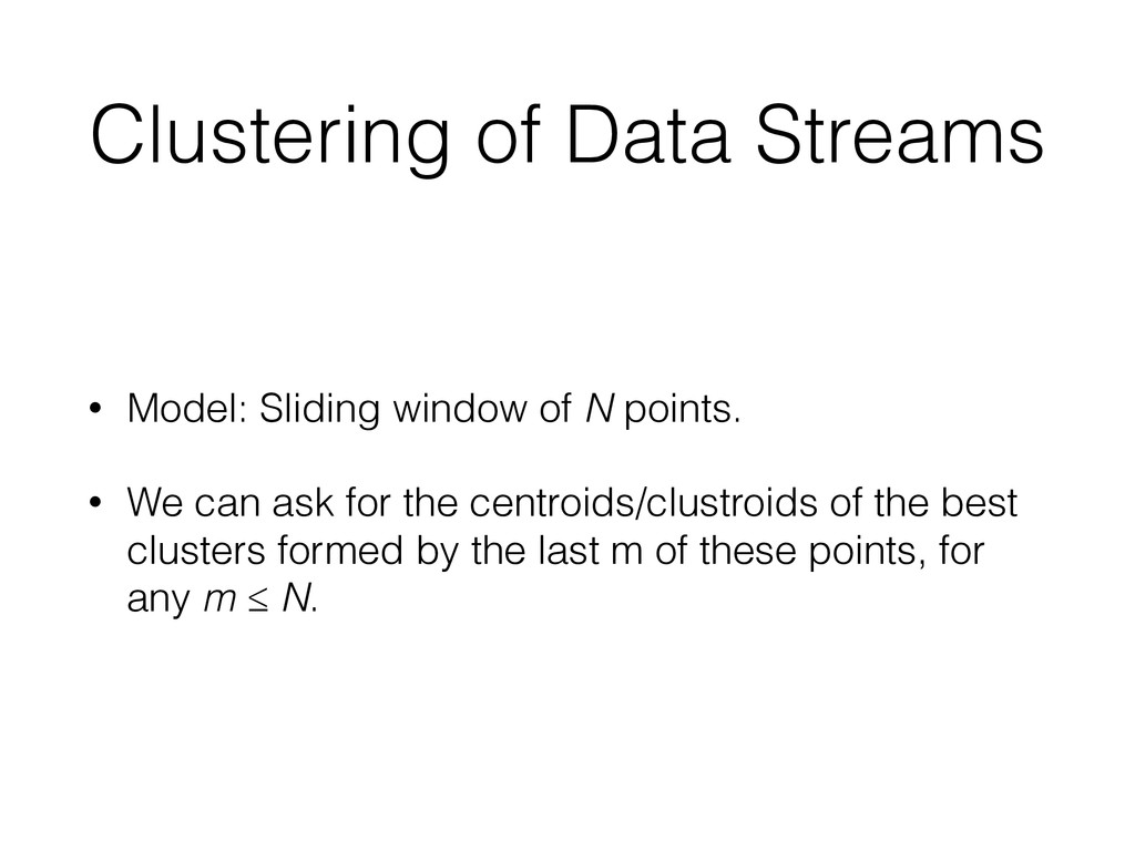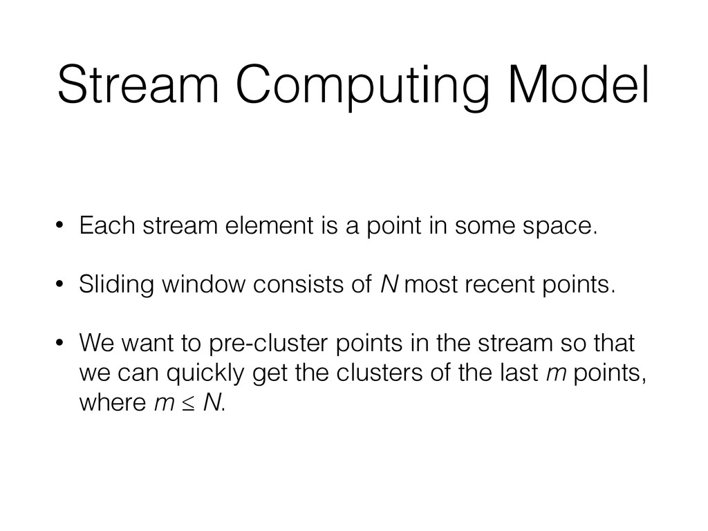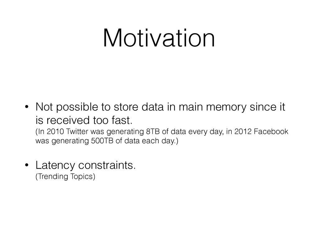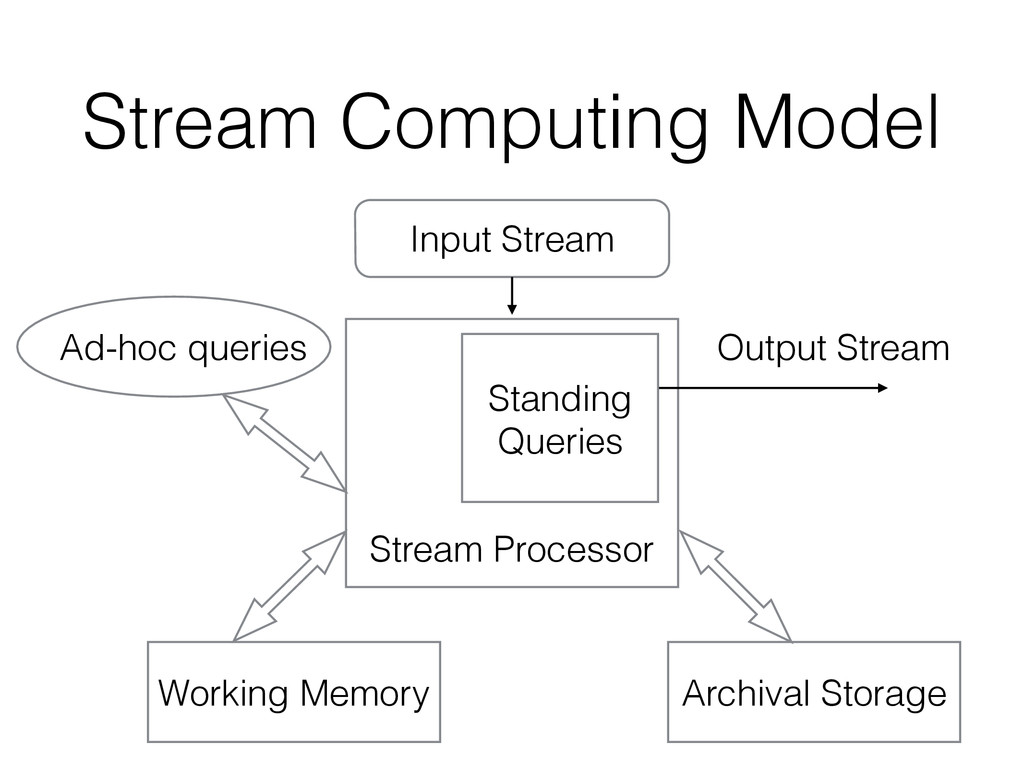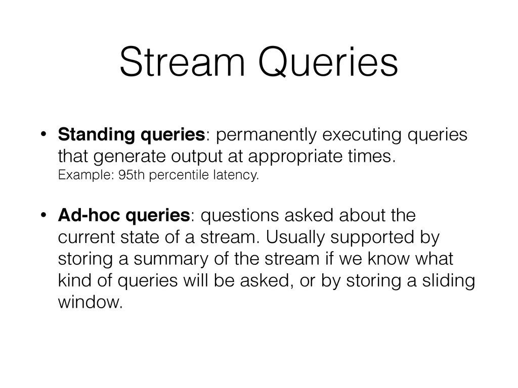 Example: 95th percentile latency. • Ad-hoc queries: questions asked about the current state of a stream. Usually supported by storing a summary of the stream if we know what kind of queries will be asked, or by storing a sliding window.