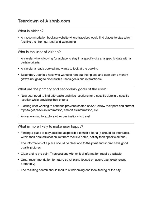 website where travelers would find places to stay which feel like their homes, local and welcoming Who is the user of Airbnb? - A traveler who is looking for a place to stay in a specific city at a specific date with a certain criteria - A traveler already booked and wants to look at the booking - Secondary user is a host who wants to rent out their place and earn some money (We're not going to discuss this user's goals and interactions) What are the primary and secondary goals of the user? - New user need to find affordable and nice locations for a specific date in a specific location while providing their criteria - Existing user wanting to continue previous search and/or review their past and current trips to get check-in information, amenities information, etc. - A user wanting to explore other destinations to travel What is more likely to make user happy? - Finding a place to stay as close as possible to their criteria (it should be affordable, within their desired location, let them feel like home, satisfy their specific criteria) - The information of a place should be clear and to the point and should have good quality pictures - Clear and to the point Trips sections with critical information readily available - Great recommendation for future travel plans (based on user's past experiences preferably) - The resulting search should lead to a welcoming and local feeling of the city