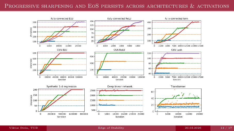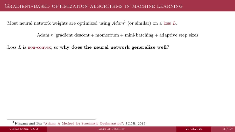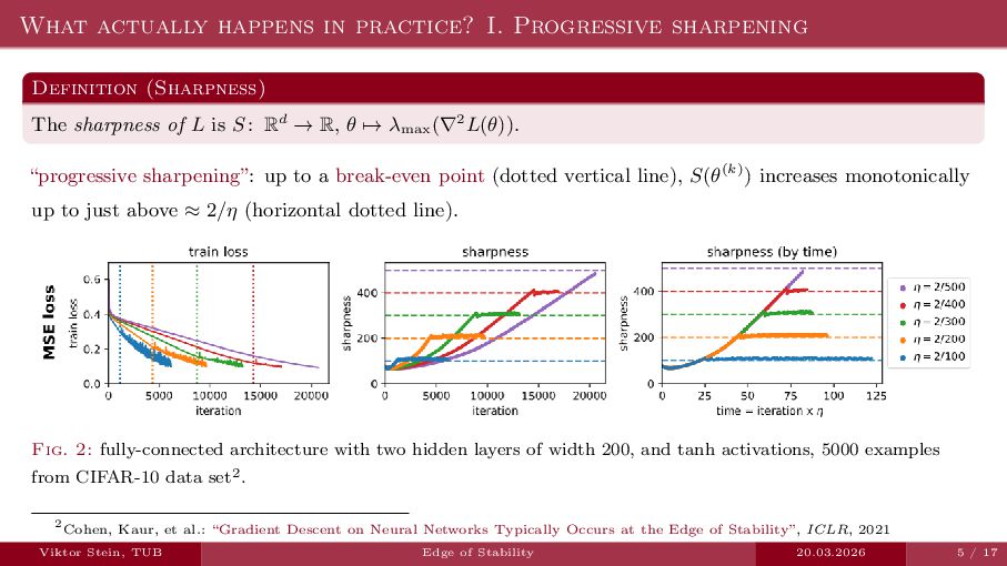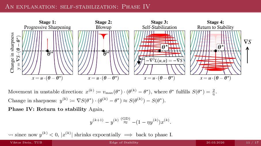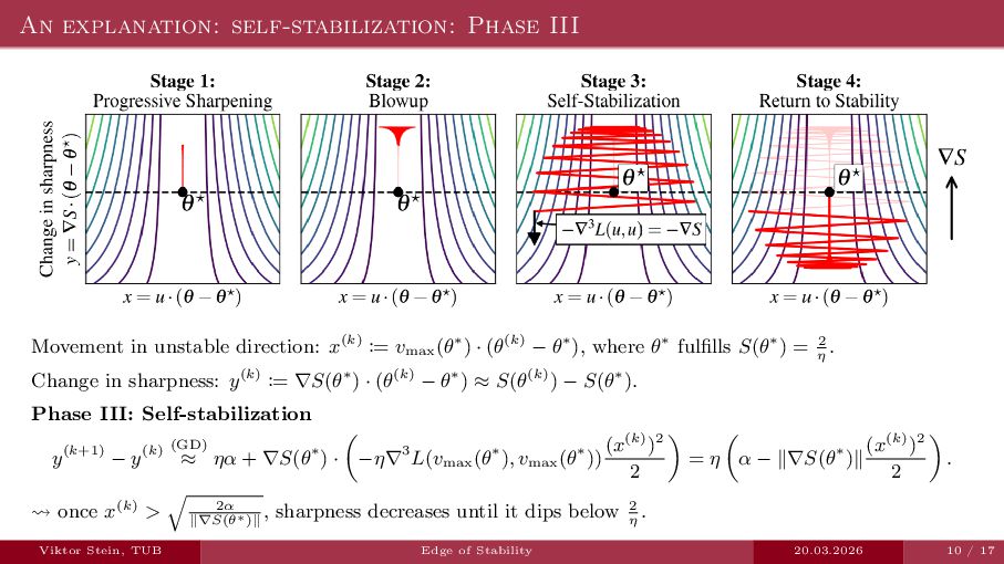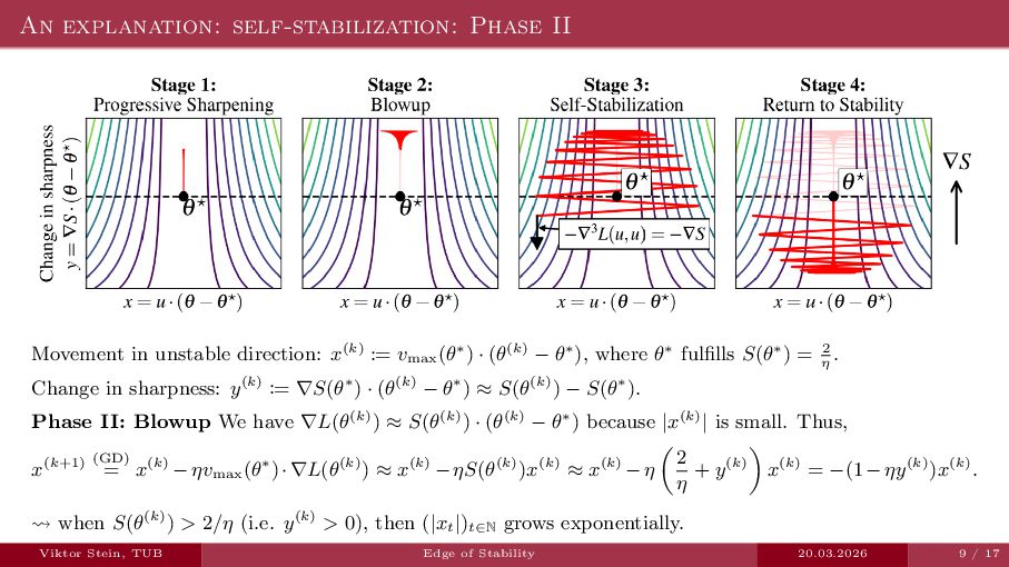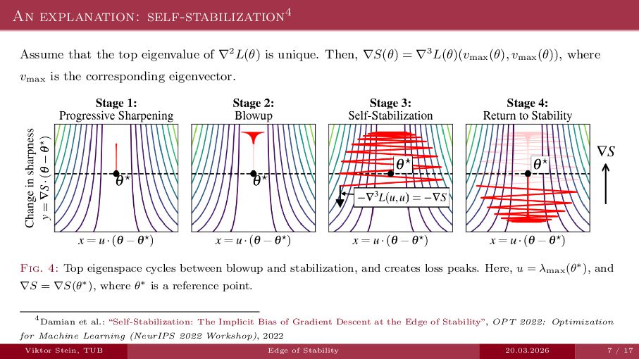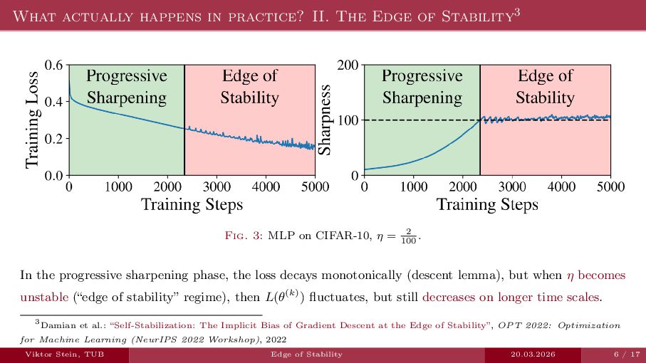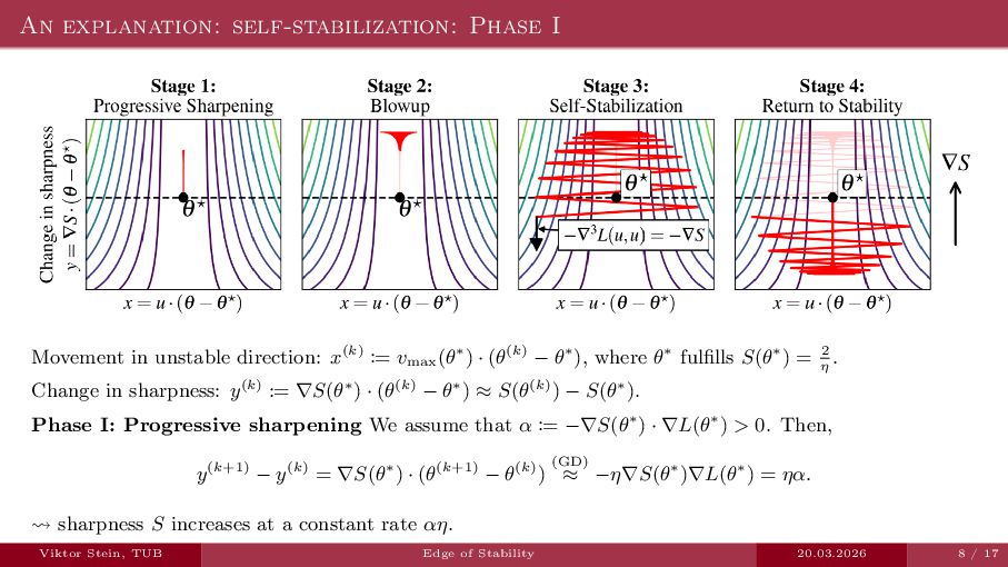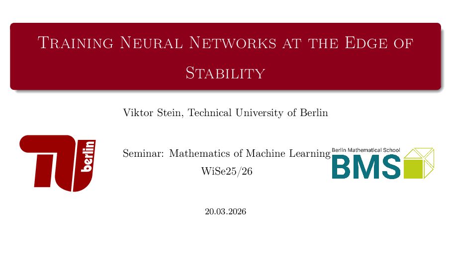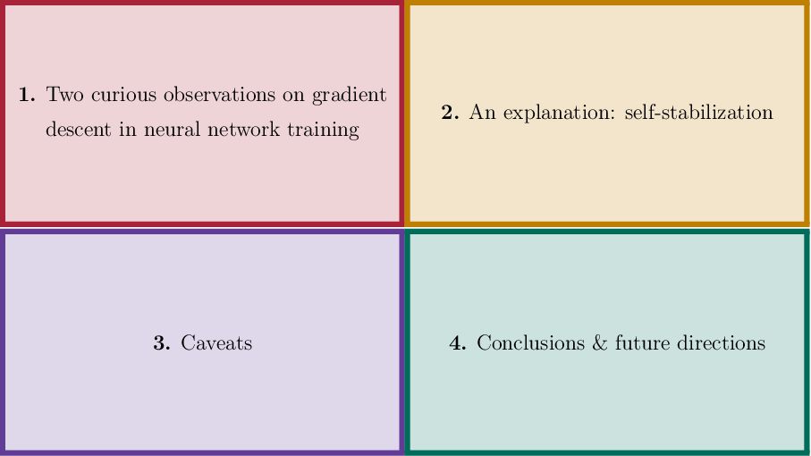 An expository talk about neural network training (progressive sharpening, edge of stability, self-stabilization) based on the two papers "Self-Stabilization: The Implicit Bias of Gradient Descent at the Edge of Stability" by Damian et al., and "Gradient descent on neural networks typically occurs at the edge of stability" by Cohen et la.