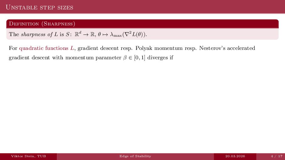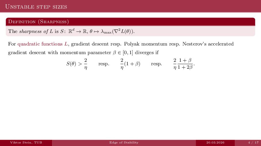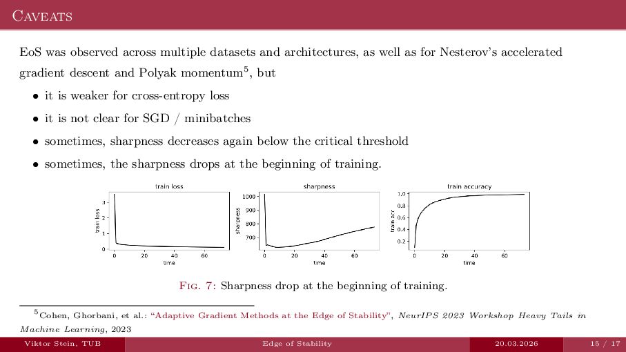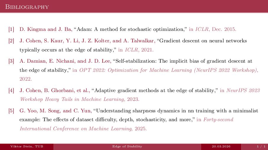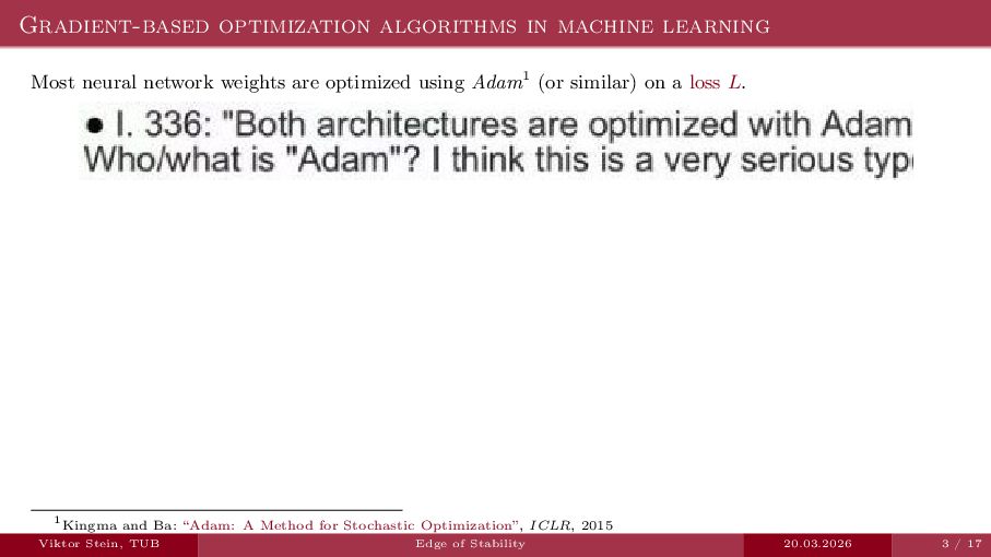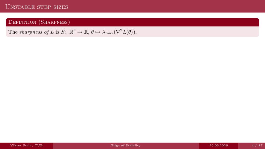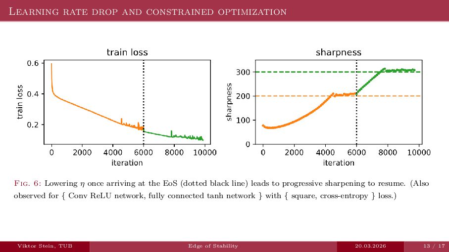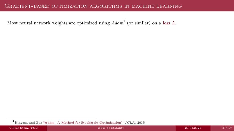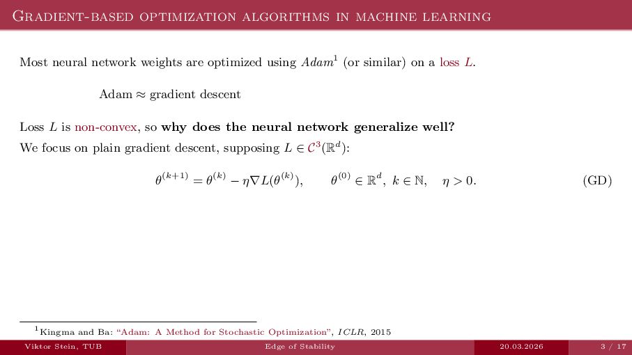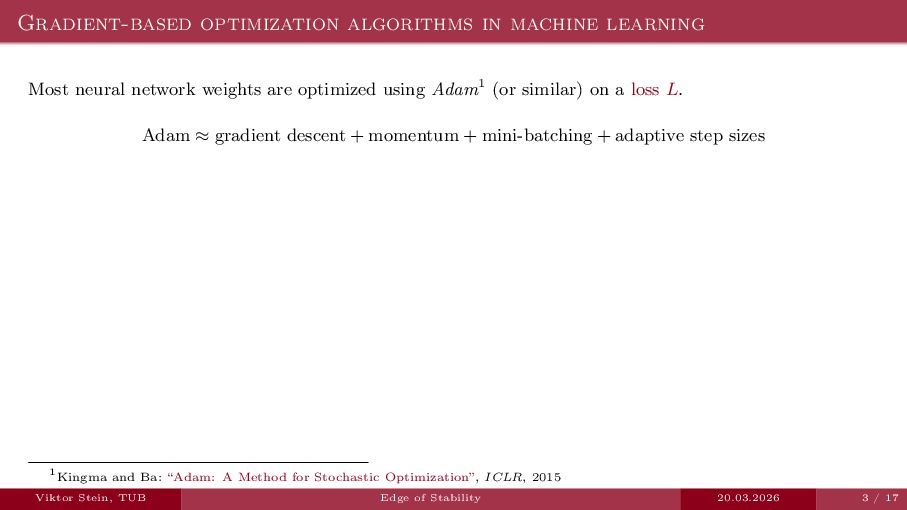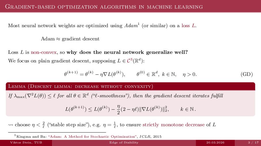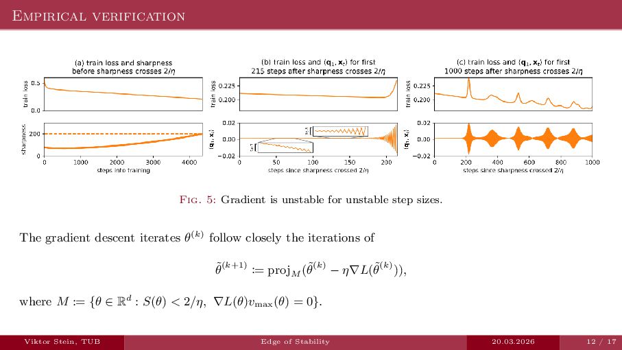 An expository talk about neural network training (progressive sharpening, edge of stability, self-stabilization) based on the two papers "Self-Stabilization: The Implicit Bias of Gradient Descent at the Edge of Stability" by Damian et al., and "Gradient descent on neural networks typically occurs at the edge of stability" by Cohen et la.