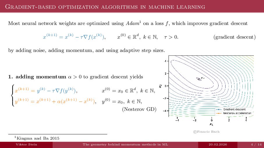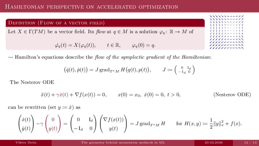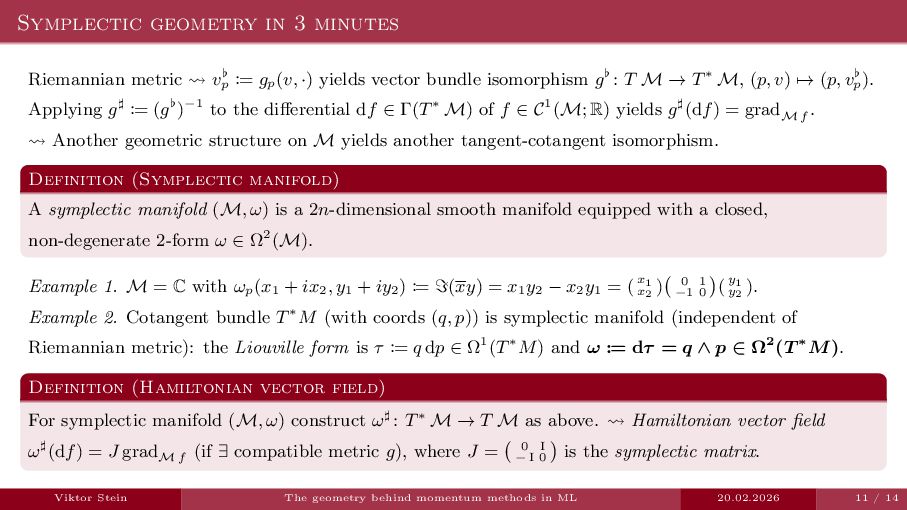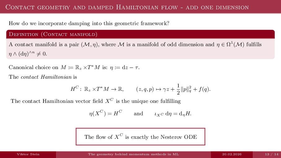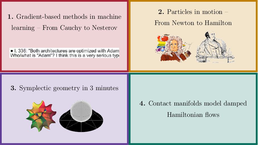 In this talk, I will gently introduce the contact geometry behind time-dependent Hamiltonian systems and show how viewing momentum-based methods in machine learning through this geometric lens can help elucidate their properties.
