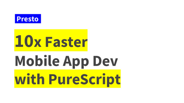 ClojureScript Haskell Like + Strong FP - Focus on Purity, Composition, Concise. + Types - Few errors, Easy refactoring JS Integration + Solid and easy JS FFI + JS Code Small & Reliable - New and evolving + Implements all Haskell’s features and access to most Haskell Libraries. - Large size JS and not so reliable runtime + Is a Lisp! + Strong Developer community + Proven runtime - Lacks Types - Lacks strong math / category theory foundation of Haskell CPS (Continuation Passing) Elm Architecture / Redux Pure FRP Maps directly to UX flows / flows as conversion funnel. Global state complicates transactional flows vs CPS manages local state in stack More general than CPS but complicates UX flows. Presto will add FRP support in future