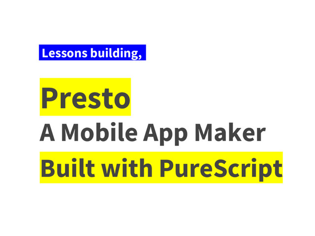 ClojureScript Haskell Like + Strong FP - Focus on Purity, Composition, Conciseness. + Types - Few errors, Easy refactoring JS Integration + Solid and easy JS FFI + JS Code Small & Reliable - New and evolving + Implements all Haskell’s features and access to most Haskell Libraries. - Large size JS and not so reliable runtime + Is a Lisp! + Strong Developer community + Proven runtime - Lacks Types - Lacks strong math / category theory foundation of Haskell CPS (Continuation Passing) Elm Architecture / Redux Pure FRP Maps directly to UX flows / flows as conversion funnel. Global state complicates transactional flows vs CPS manages local state in stack More general than CPS but complicates UX flows. Presto will add FRP support in future