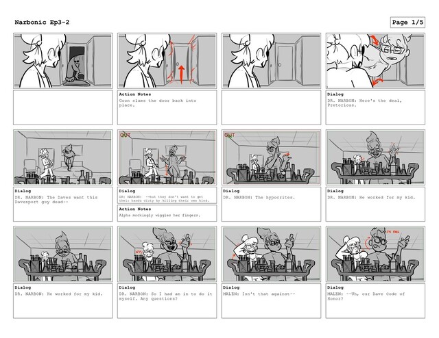 people-- Action Notes Narbon plucks a wine glass mixed between the acid vials. Dialog DR. NARBON: --betray-- Dialog DR. NARBON: --their codes all the time! Dialog DR. NARBON: You ever betray anyone? Dialog DR. NARBON: Hell, look at you, of course you have. Action Notes Dr. Narbon elbows Malen, knocking his sunglasses off. Dialog DR. NARBON: Want a drink? Action Notes Dr. Narbon offers an acid vial instead of the wine bottle (intentionally) Action Notes The vial bubbles Dialog MALEN: May-- Dialog MALEN: --be-- Dialog MALEN: --later. Narbonic Ep3-2 Page 2/5