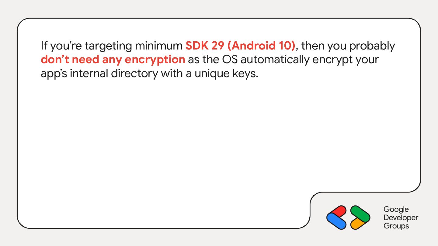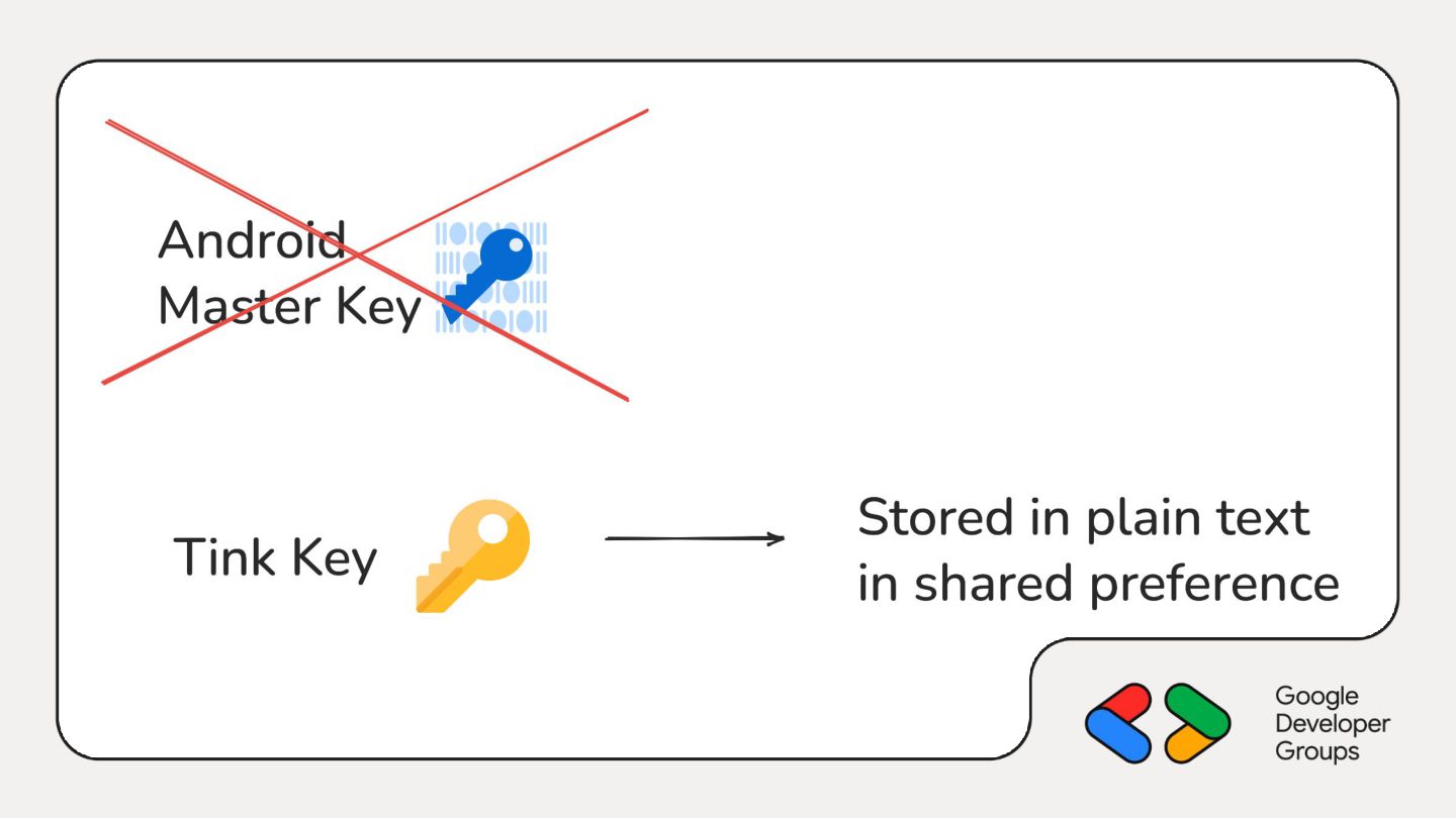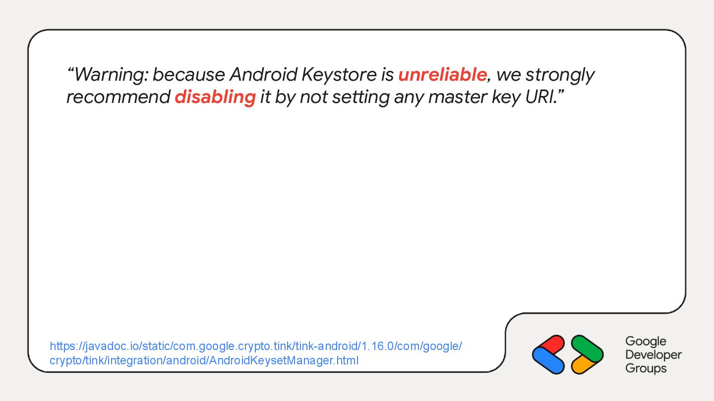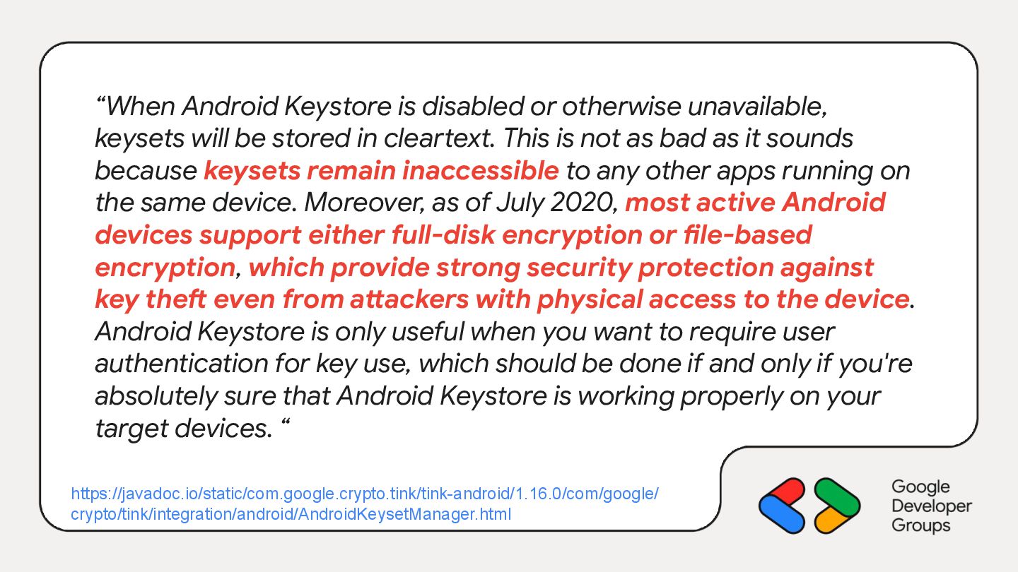 be stored in cleartext. This is not as bad as it sounds because keysets remain inaccessible to any other apps running on the same device. Moreover, as of July 2020, most active Android devices support either full-disk encryption or file-based encryption, which provide strong security protection against key theft even from attackers with physical access to the device. Android Keystore is only useful when you want to require user authentication for key use, which should be done if and only if you're absolutely sure that Android Keystore is working properly on your target devices. “ https://javadoc.io/static/com.google.crypto.tink/tink-android/1.16.0/com/google/ crypto/tink/integration/android/AndroidKeysetManager.html