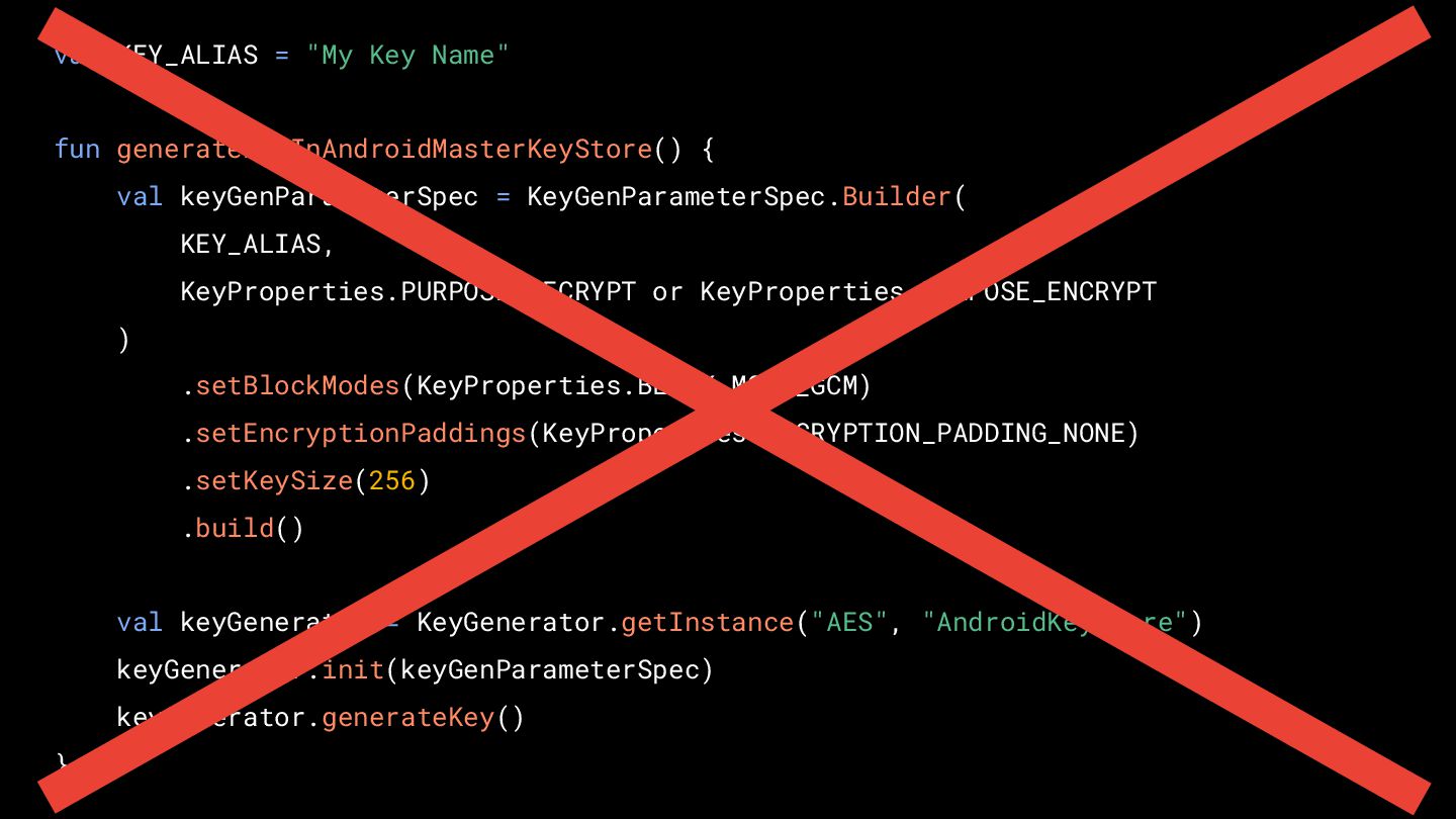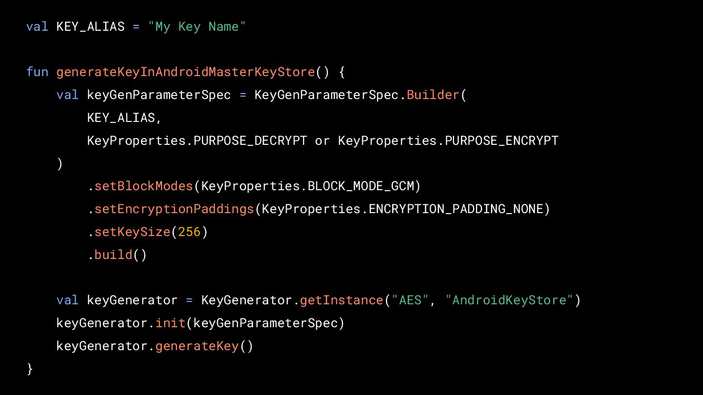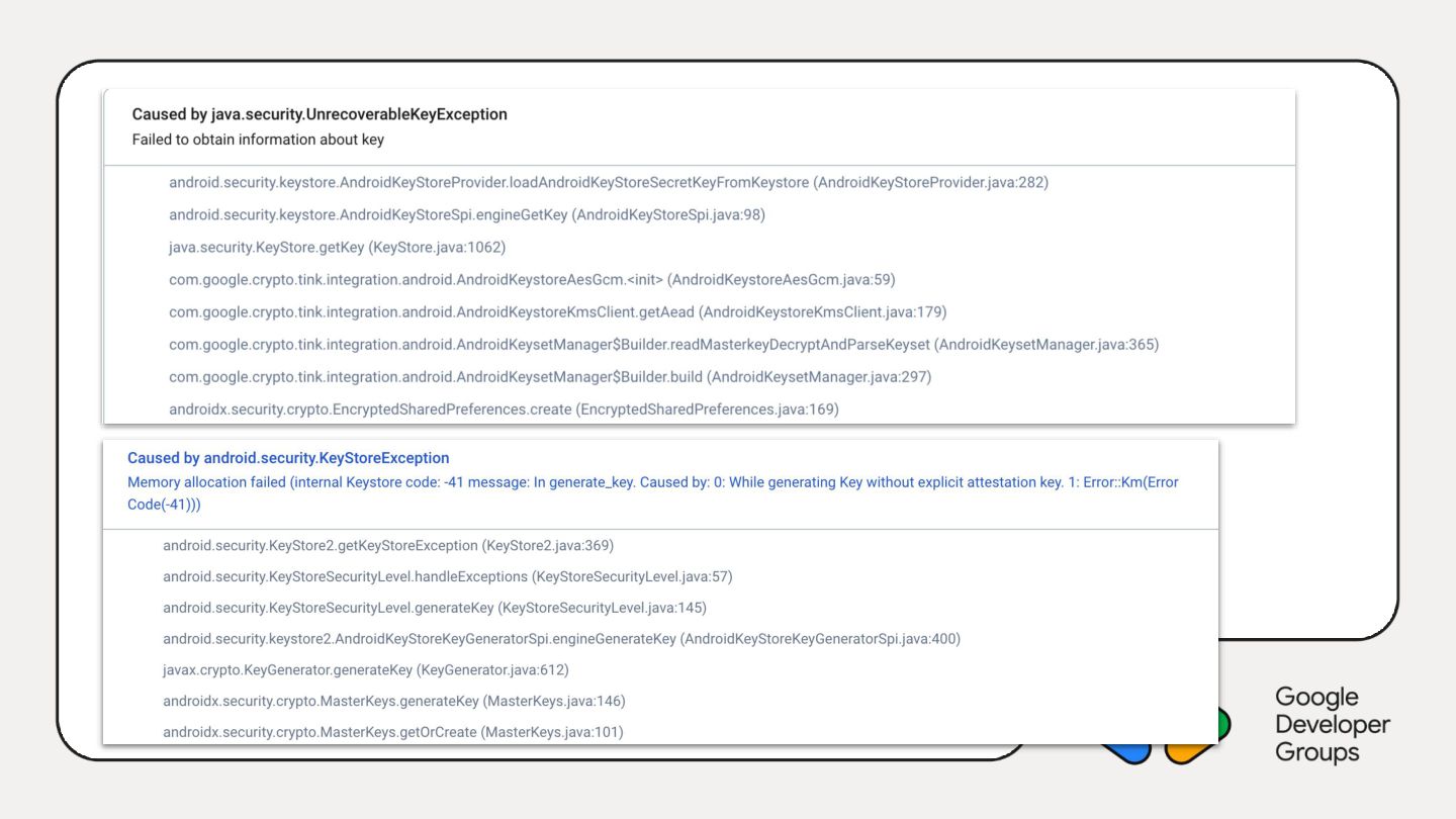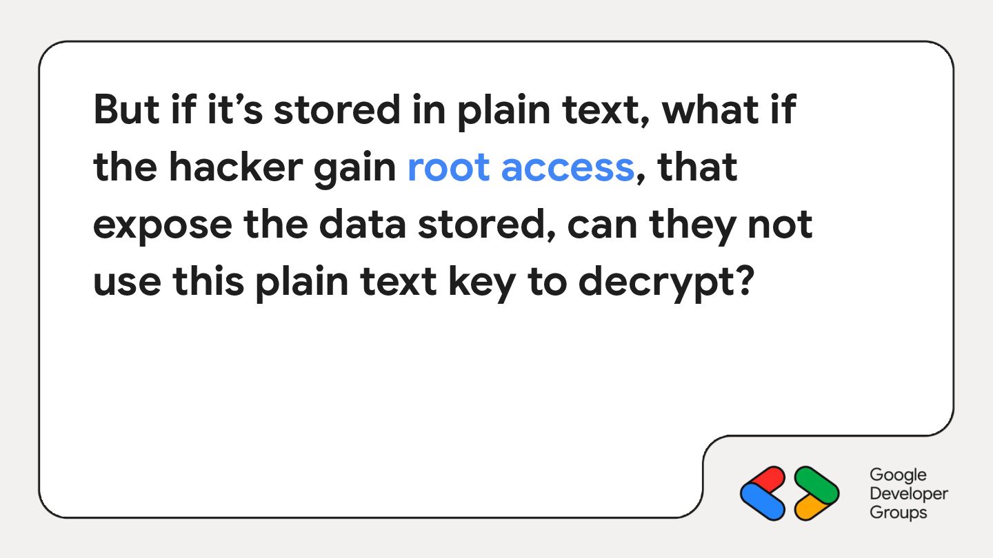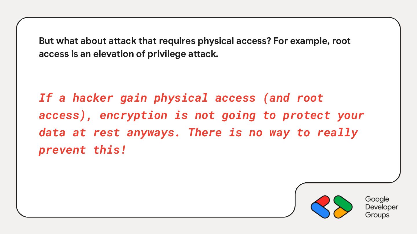 be stored in cleartext. This is not as bad as it sounds because keysets remain inaccessible to any other apps running on the same device. Moreover, as of July 2020, most active Android devices support either full-disk encryption or file-based encryption, which provide strong security protection against key theft even from attackers with physical access to the device. Android Keystore is only useful when you want to require user authentication for key use, which should be done if and only if you're absolutely sure that Android Keystore is working properly on your target devices. “ https://javadoc.io/static/com.google.crypto.tink/tink-android/1.16.0/com/google/ crypto/tink/integration/android/AndroidKeysetManager.html