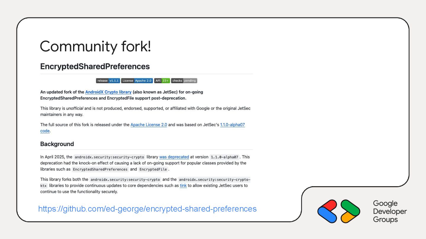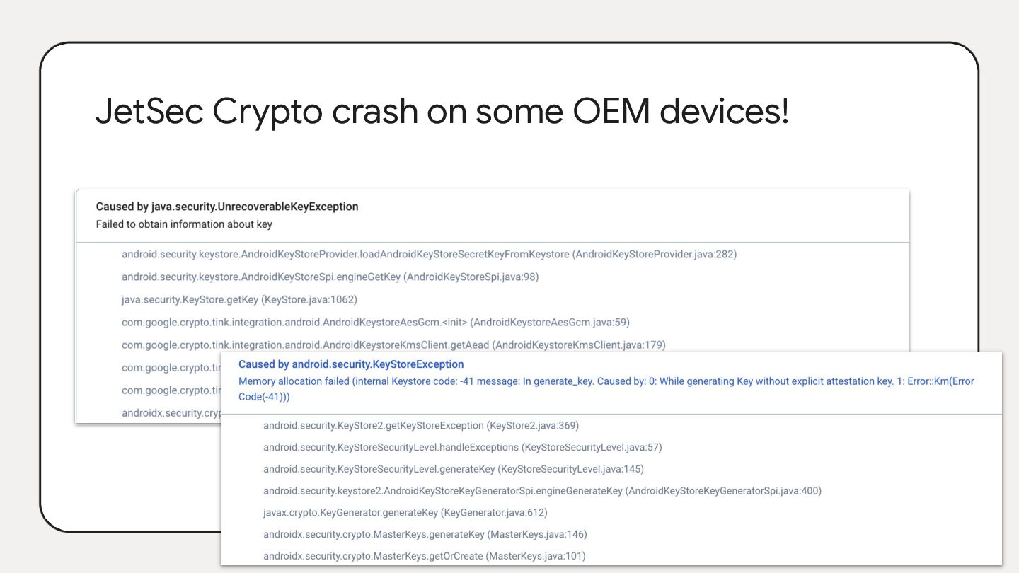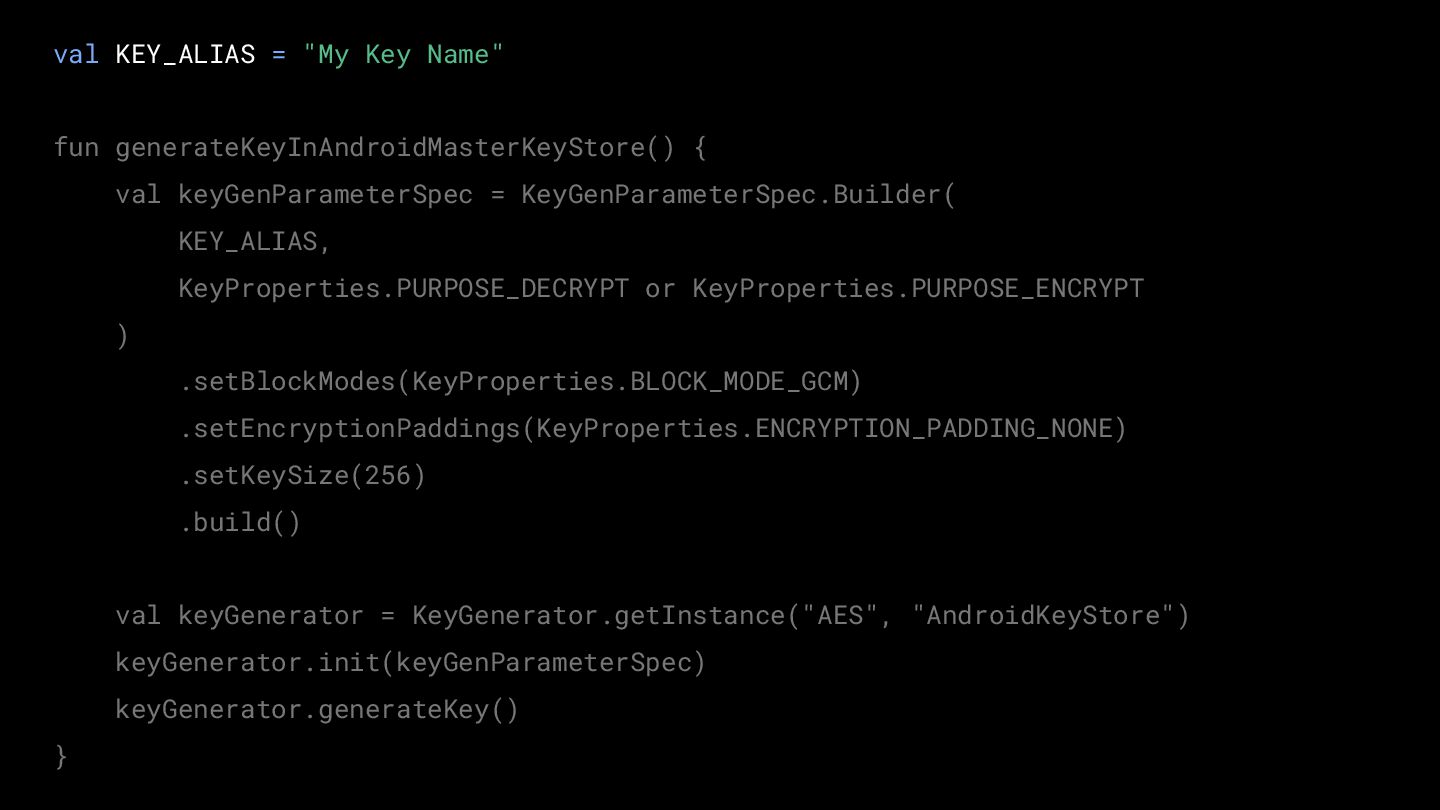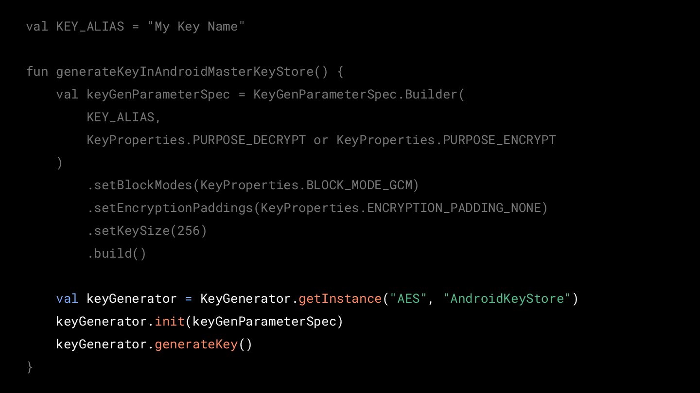 be stored in cleartext. This is not as bad as it sounds because keysets remain inaccessible to any other apps running on the same device. Moreover, as of July 2020, most active Android devices support either full-disk encryption or file-based encryption, which provide strong security protection against key theft even from attackers with physical access to the device. Android Keystore is only useful when you want to require user authentication for key use, which should be done if and only if you're absolutely sure that Android Keystore is working properly on your target devices. “ https://javadoc.io/static/com.google.crypto.tink/tink-android/1.16.0/com/google/ crypto/tink/integration/android/AndroidKeysetManager.html
