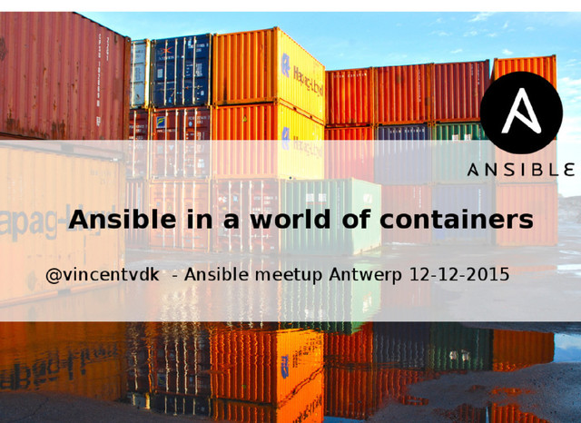 used to orchestrate small Docker deployments Control the environment rather than the runtime (Swarm, Kubernetes, Cloud, ..) Use Docker for Ansible development / testing Ansible is flexible to adapt.