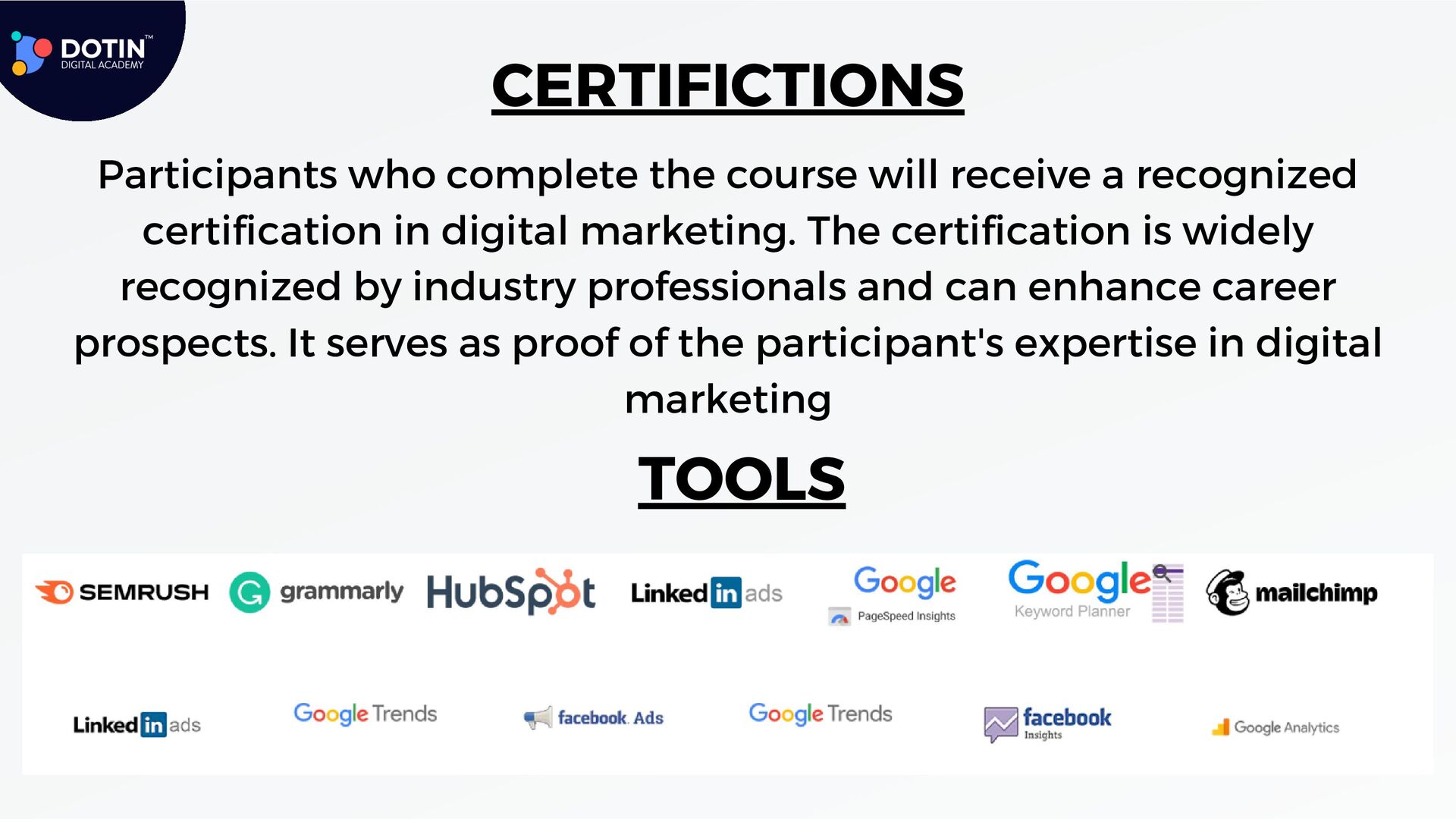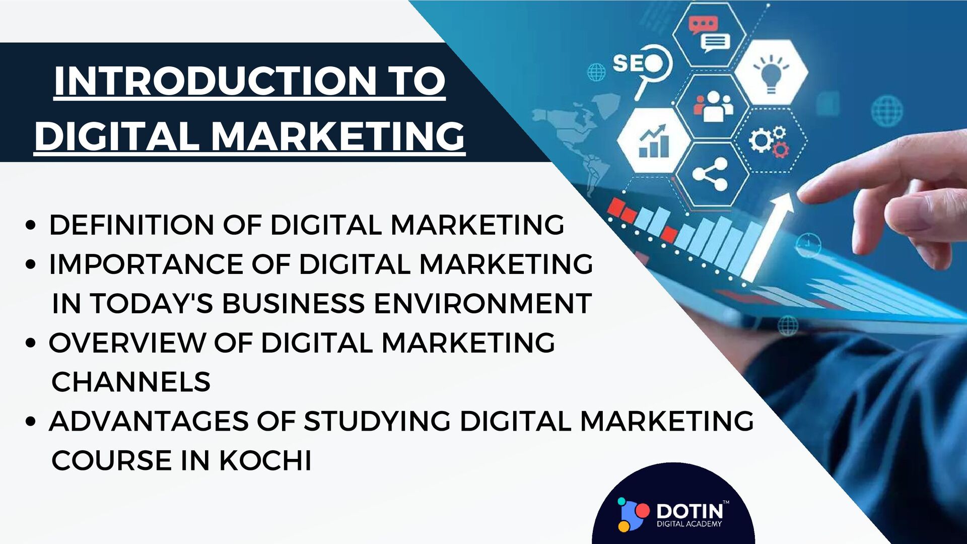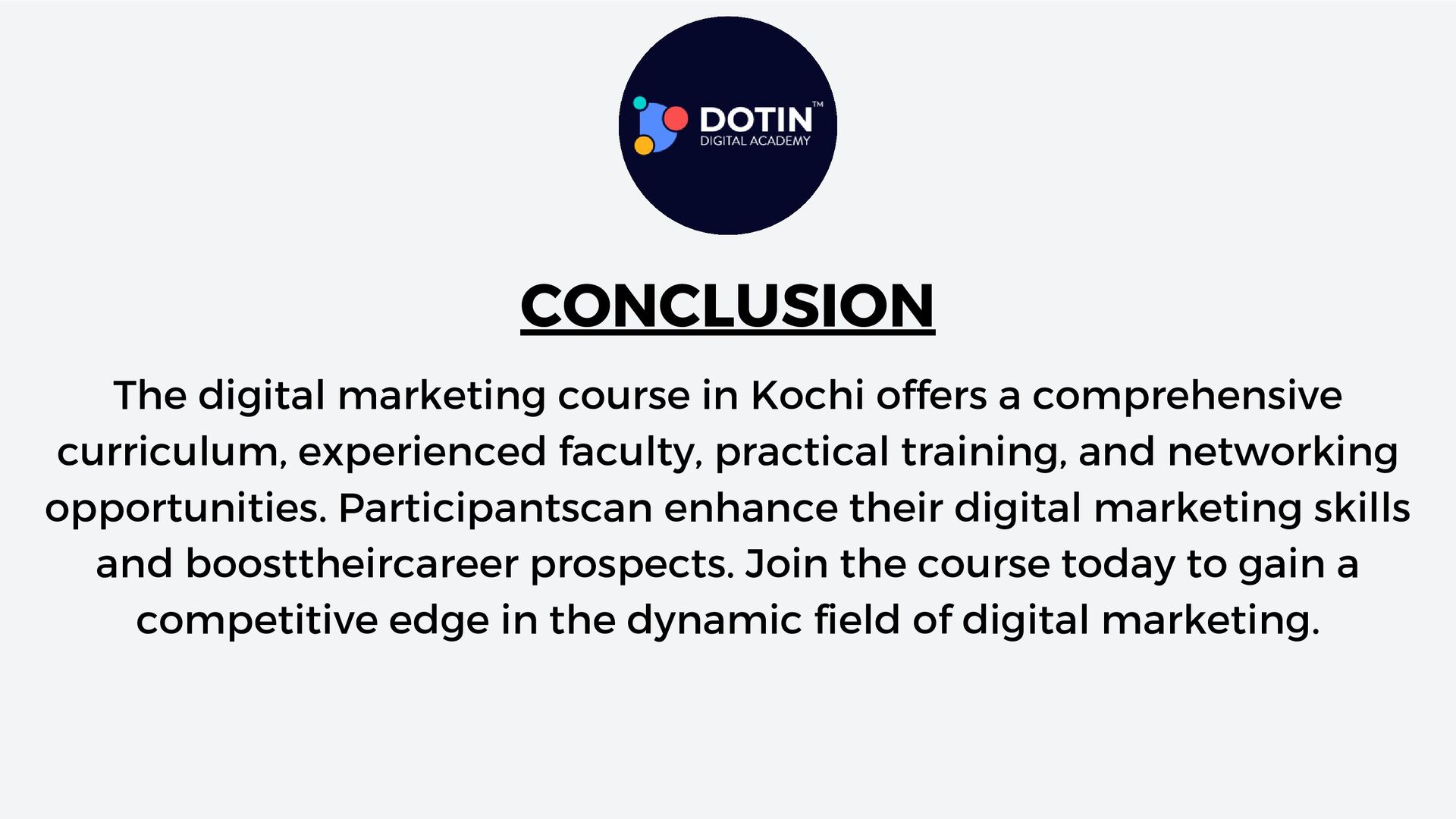Searching for a top digital marketing course in Kochi, Kerala? Sign up for Dotin Digital Academy for a structured and systematic way of learning Digital Marketing In Kochi. This advanced digital marketing course provides practical-oriented classes and allows learners to work on live projects and real companies. It opens the door to getting detailed and intensive training in Search Engine Optimization, Google Ads, Google Analytics, Social Media Marketing, Email Marketing, and even web development for Students. Build a career in Digital Marketing with Dotin Digital Academy. Dotin Digital Academy is the best option for digital marketing courses in Kochi.
