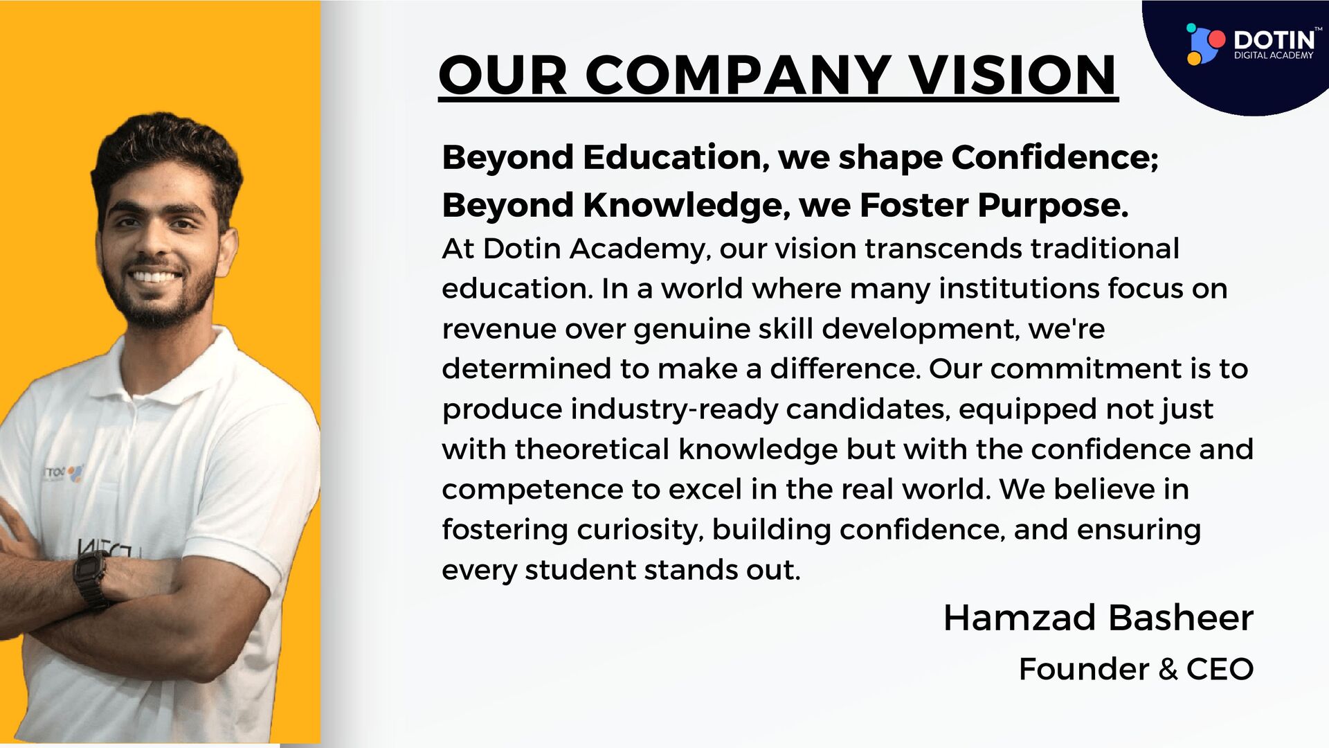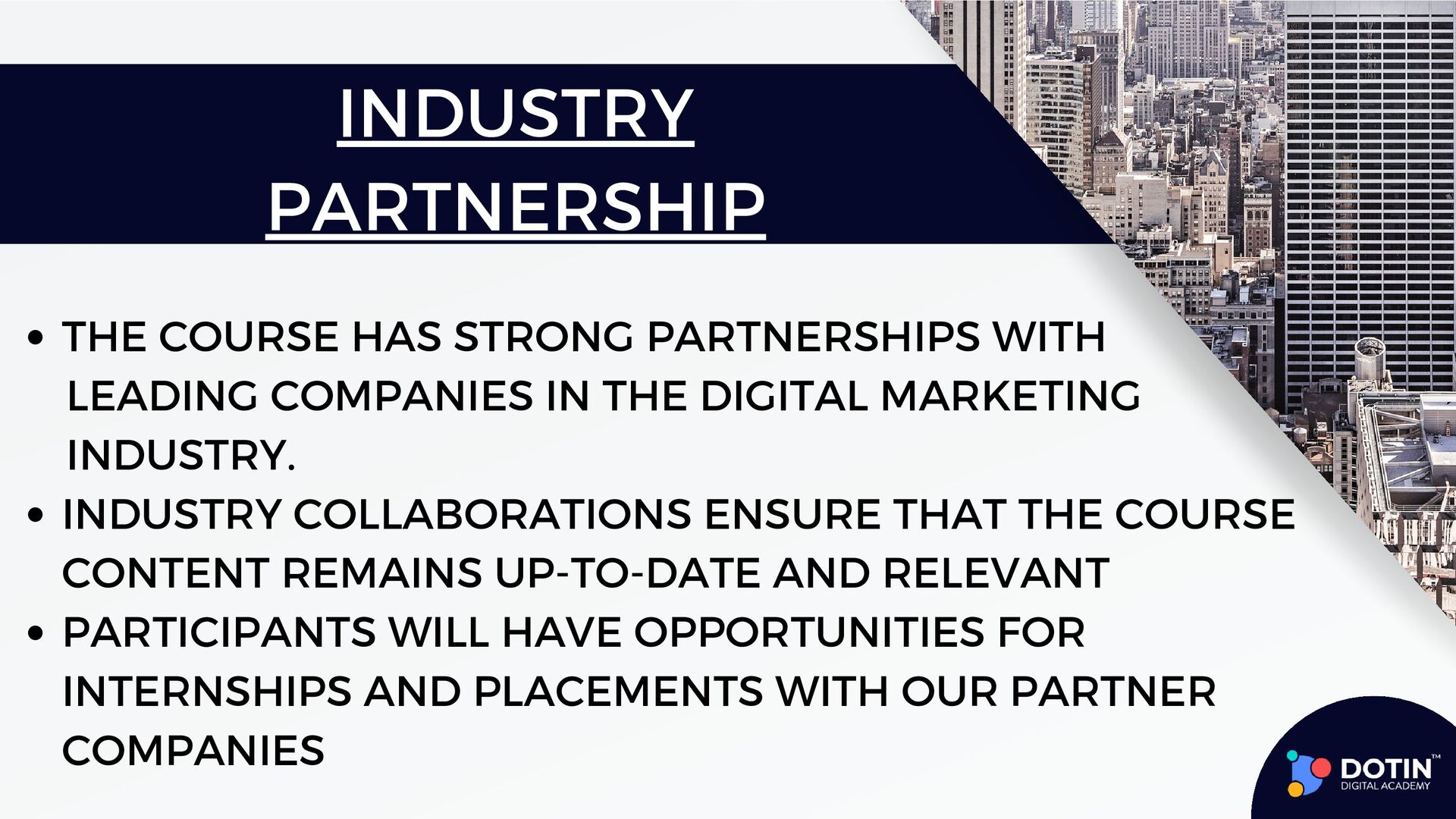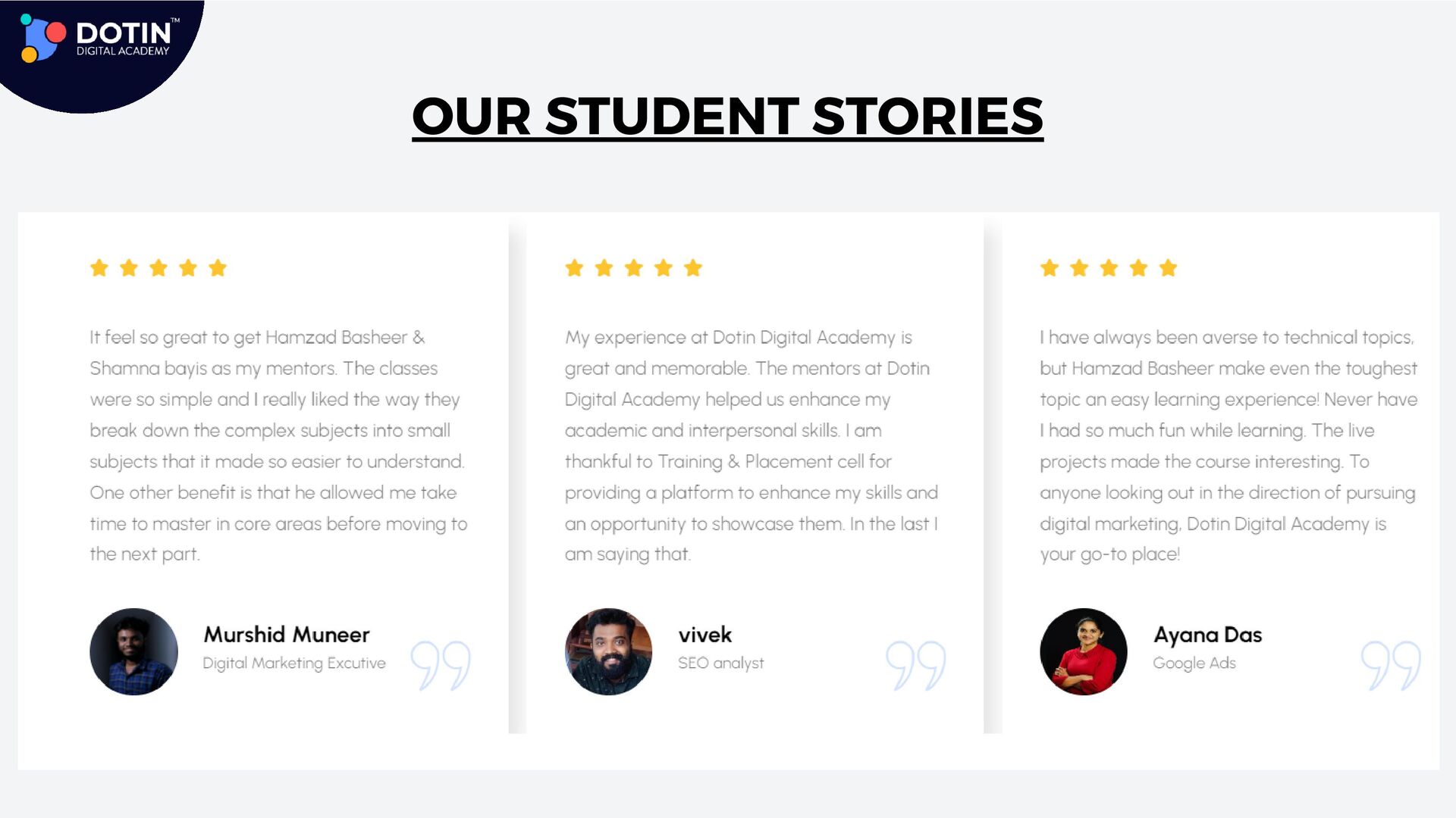 Searching for a top digital marketing course in Kochi, Kerala? Sign up for Dotin Digital Academy for a structured and systematic way of learning Digital Marketing In Kochi. This advanced digital marketing course provides practical-oriented classes and allows learners to work on live projects and real companies. It opens the door to getting detailed and intensive training in Search Engine Optimization, Google Ads, Google Analytics, Social Media Marketing, Email Marketing, and even web development for Students. Build a career in Digital Marketing with Dotin Digital Academy. Dotin Digital Academy is the best option for digital marketing courses in Kochi.