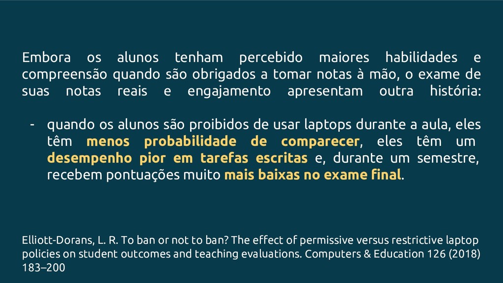 são obrigados a tomar notas à mão, o exame de suas notas reais e engajamento apresentam outra história: - quando os alunos são proibidos de usar laptops durante a aula, eles têm menos probabilidade de comparecer, eles têm um desempenho pior em tarefas escritas e, durante um semestre, recebem pontuações muito mais baixas no exame final. Elliott-Dorans, L. R. To ban or not to ban? The effect of permissive versus restrictive laptop policies on student outcomes and teaching evaluations. Computers & Education 126 (2018) 183–200