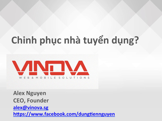 dụng công thức 2-‐2-‐3 • Biết rõ năng lực bản thân • Biết rõ nhu cầu thị trường • Tìm công việc / vị trí phù hợp và yêu nó • Tìm nhà tuyển dụng phù hợp và chinh phục • Quyết tâm chinh phục qua 3 bước: 1. Làm quen, xin email, điện thoại 2. Viết thư giới thiệu, trao đổi thường xuyên 3. Chứng tỏ năng lực + quyết tâm + đam mê