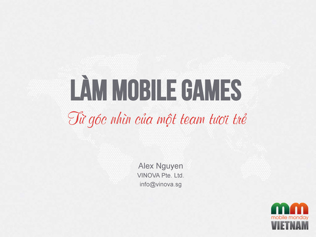 thành lập tại Singapore • 2011 chi nhánh Hà Nội – iOS / Android / Windows Phone – Cho doanh nghiệp & chính phủ Singapore – Có $ làm sản phẩm => chọn mobile game • 08/2012 bắt đầu làm game từ con số 0 – Xác định 3 năm để có thành công đầu tiên