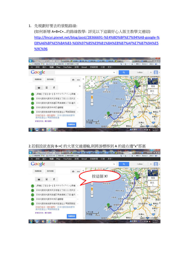1. 先規劃好要去的景點路線: (如何新增 A+B+C+…的路線教學: 詳見以下這篇好心人版主教學文連結) http://lincyi.pixnet.net/blog/post/28366691-%E4%BD%BF%E7%94%A8-google-% E8%A6%8F%E5%8A%83-%E6%97%85%E9%81%8A%E8%B7%AF%E7%B7%9A%E5 %9C%96 2.若假設欲查詢 B->C