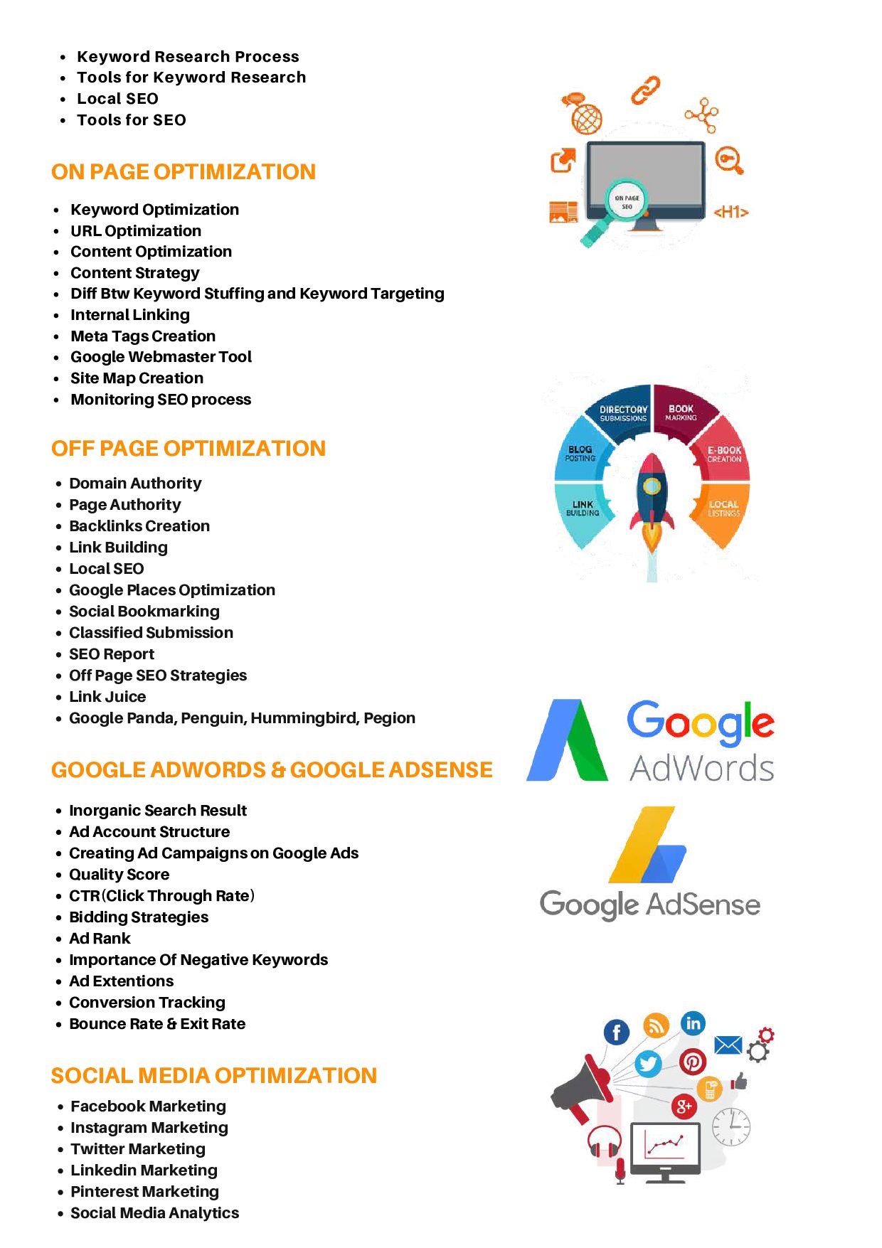 Structure Creating Ad Campaigns on Google Ads Quality Score CTR(Click Through Rate) Bidding Strategies Ad Rank Importance Of Negative Keywords Ad Extentions Conversion Tracking Bounce Rate & Exit Rate SOCIAL MEDIA OPTIMIZATION Facebook Marketing Instagram Marketing Twitter Marketing Linkedin Marketing Pinterest Marketing Social Media Analytics Keyword Optimization URL Optimization Content Optimization Content Strategy Diff Btw Keyword Stuffing and Keyword Targeting Internal Linking Meta Tags Creation Google Webmaster Tool Site Map Creation Monitoring SEO process Domain Authority Page Authority Backlinks Creation Link Building Local SEO Google Places Optimization Social Bookmarking Classified Submission SEO Report Off Page SEO Strategies Link Juice Google Panda, Penguin, Hummingbird, Pegion OFF PAGE OPTIMIZATION ON PAGE OPTIMIZATION Keyword Research Process Tools for Keyword Research Local SEO Tools for SEO