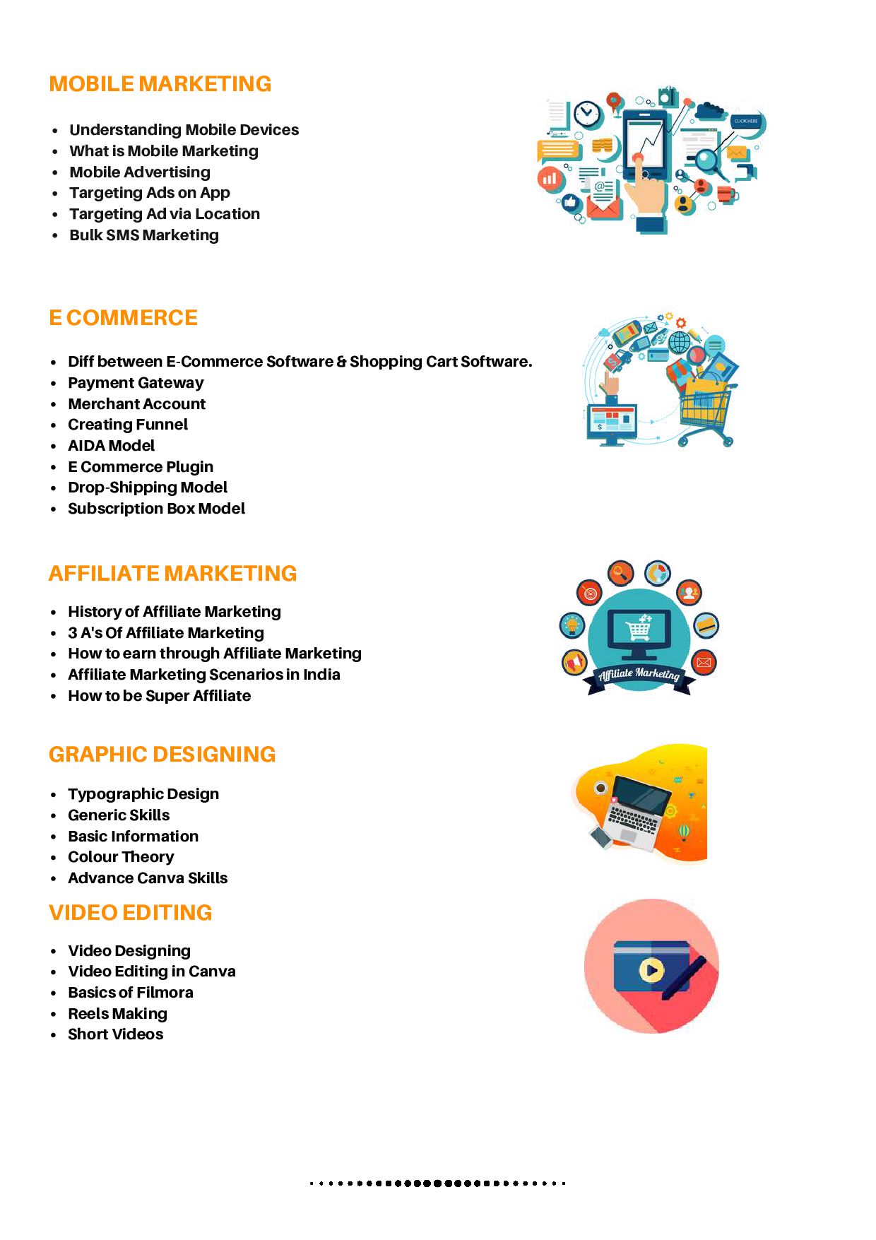 Payment Gateway Merchant Account Creating Funnel AIDA Model E Commerce Plugin Drop-Shipping Model Subscription Box Model Understanding Mobile Devices What is Mobile Marketing Mobile Advertising Targeting Ads on App Targeting Ad via Location Bulk SMS Marketing MOBILE MARKETING AFFILIATE MARKETING History of Affiliate Marketing 3 A's Of Affiliate Marketing How to earn through Affiliate Marketing Affiliate Marketing Scenarios in India How to be Super Affiliate GRAPHIC DESIGNING Typographic Design Generic Skills Basic Information Colour Theory Advance Canva Skills VIDEO EDITING Video Designing Video Editing in Canva Basics of Filmora Reels Making Short Videos