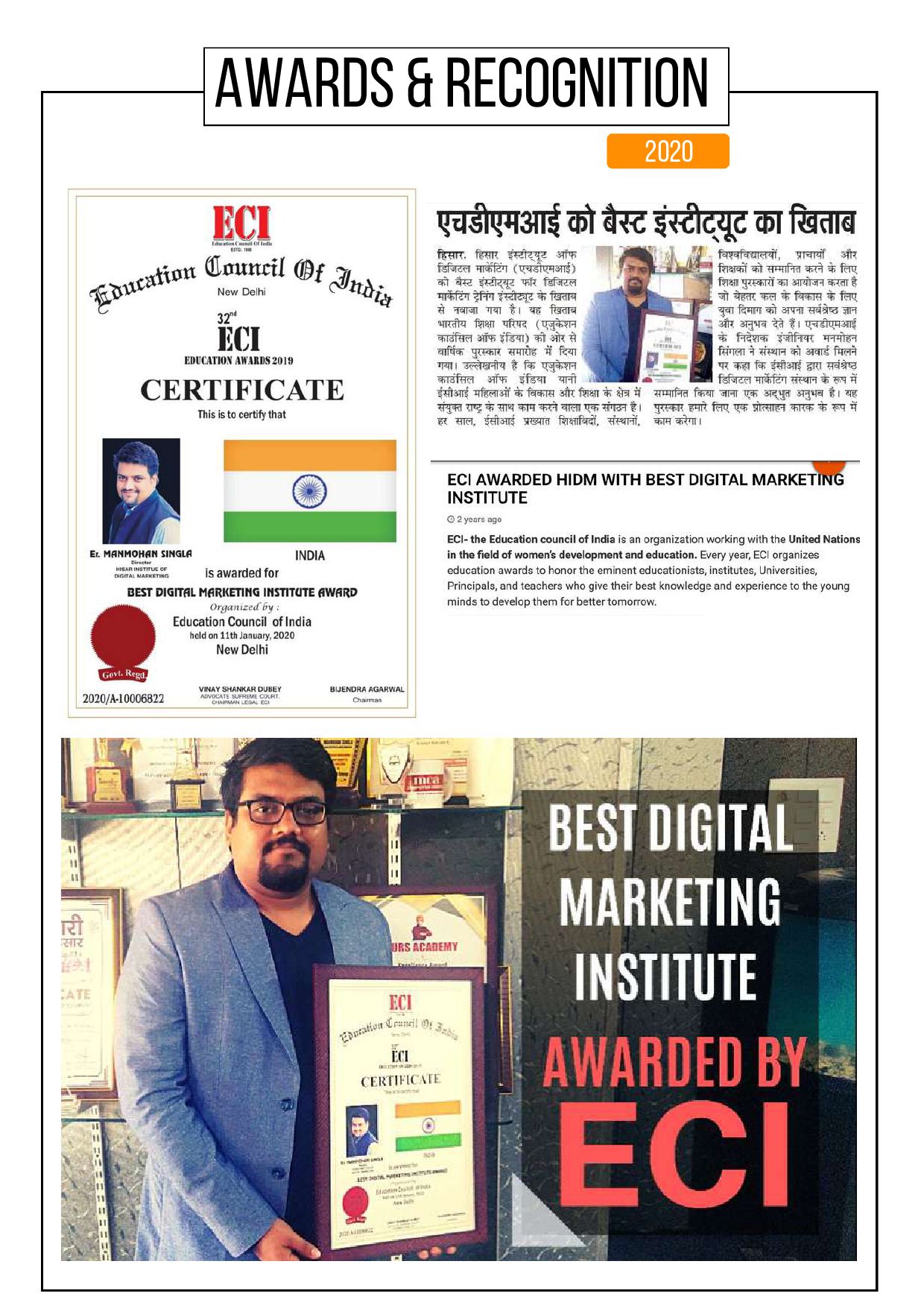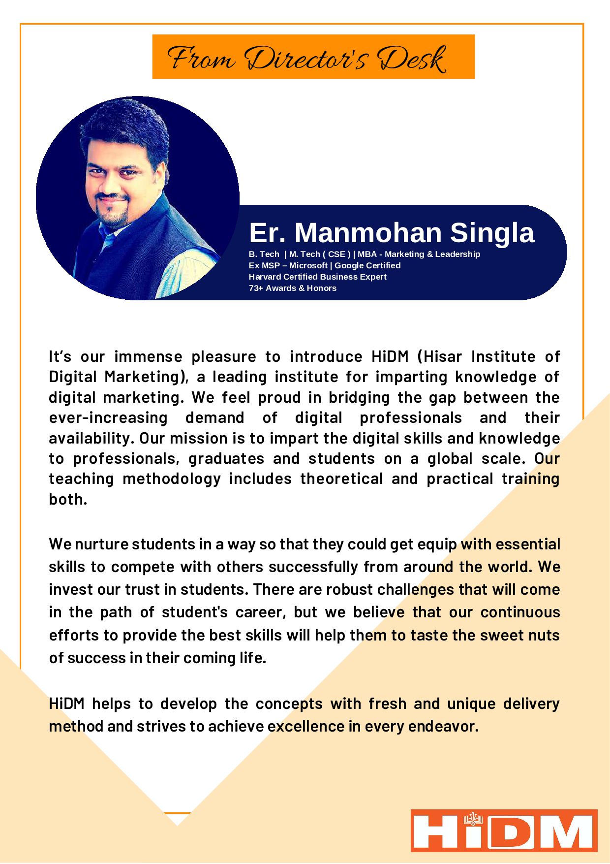 (Hisar Institute of Digital Marketing), a leading institute for imparting knowledge of digital marketing. We feel proud in bridging the gap between the ever-increasing demand of digital professionals and their availability. Our mission is to impart the digital skills and knowledge to professionals, graduates and students on a global scale. Our teaching methodology includes theoretical and practical training both. We nurture students in a way so that they could get equip with essential skills to compete with others successfully from around the world. We invest our trust in students. There are robust challenges that will come in the path of student's career, but we believe that our continuous efforts to provide the best skills will help them to taste the sweet nuts of success in their coming life. HiDM helps to develop the concepts with fresh and unique delivery method and strives to achieve excellence in every endeavor. From Director's Desk B. Tech | M. Tech ( CSE ) | MBA - Marketing & Leadership Ex MSP – Microsoft | Google Certified Harvard Certified Business Expert 73+ Awards & Honors Er. Manmohan Singla