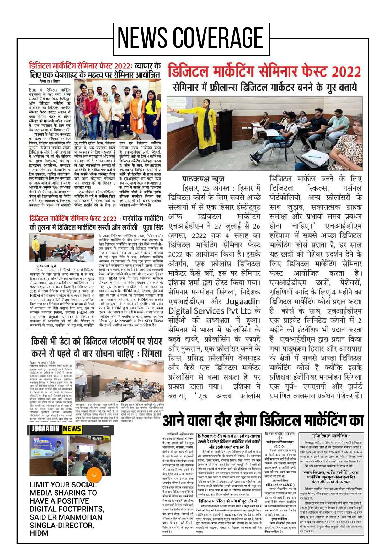 Singla on Digital Marketing. During training, the faculty was able to clear my doubts regarding decision process followed in the industry and provide real life examples " RISHAB SHARMA "My Experience of learning digital marketing from HIDM is tremendously useful .Because of my trainer Er. Manmohan Singla efforts. I am getting excellent results in my work." JAIDEEP VERMA "I like learning Digital Marketing from Hisar Institution of Digital Marketing because it has a good curriculum to learn Digital Marketing. So I can become a Digital Marketing Professional" AYUSH DEMBLA " I am a technophile person. I joined HiDM to learn how can i increase the visibility of my technology startup. After completing my course in digital marketing from HiDM, now i can precisely say that HiDM is the best institute for learning digital marketing in Hisar." DEEPAK KUMAR "This course gives a fantastic educational base from which you can build a business presence across multiple digital channels with ease. Here i learned insights, ideas and inspiration for modern marketers, quality of smart selling" HIMANSHU KATHURIA RAGHAV GUPTA "HiDM expects nothing less then the best from each and every students. The curriculum of the course is very insightful . They provide job oriented course with full dedication" STUDENTS SAID THE NICEST THINGS