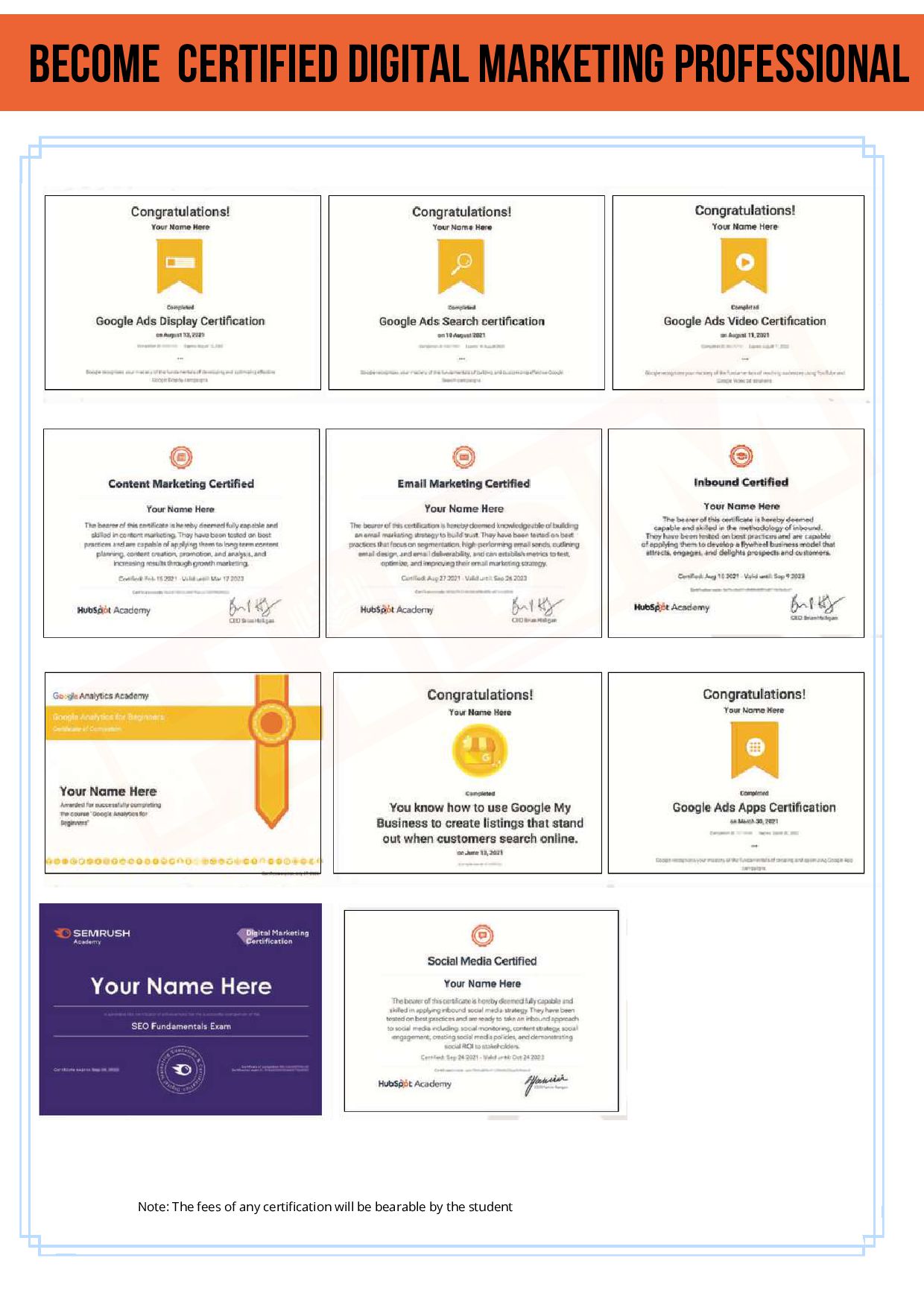 by Digital Marketing professional Affordable fees Live projects and practical training under private limited firm for 2 months Internship Opportunities Job Assistance 15 plus tools 50+ briefly discussed modules 10 + Certifications from Google, Hubspot & Facebook Seminars/Webinars Regular Tests Project Report Entrepreneurial Skills CCTV survelliance