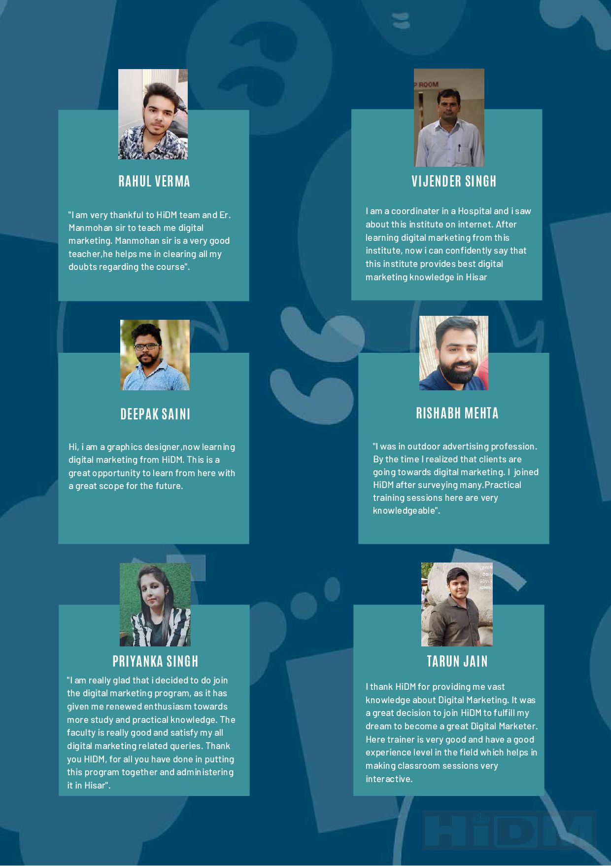 HiDM. This is a great opportunity to learn from here with a great scope for the future. DEEPAK SAINI I am a coordinater in a Hospital and i saw about this institute on internet. After learning digital marketing from this institute, now i can confidently say that this institute provides best digital marketing knowledge in Hisar VIJENDER SINGH "I was in outdoor advertising profession. By the time I realized that clients are going towards digital marketing. I joined HiDM after surveying many.Practical training sessions here are very knowledgeable". RISHABH MEHTA "I am very thankful to HiDM team and Er. Manmohan sir to teach me digital marketing. Manmohan sir is a very good teacher,he helps me in clearing all my doubts regarding the course". "I am really glad that i decided to do join the digital marketing program, as it has given me renewed enthusiasm towards more study and practical knowledge. The faculty is really good and satisfy my all digital marketing related queries. Thank you HIDM, for all you have done in putting this program together and administering it in Hisar". PRIYANKA SINGH RAHUL VERMA TARUN JAIN I thank HiDM for providing me vast knowledge about Digital Marketing. It was a great decision to join HiDM to fulfill my dream to become a great Digital Marketer. Here trainer is very good and have a good experience level in the field which helps in making classroom sessions very interactive.